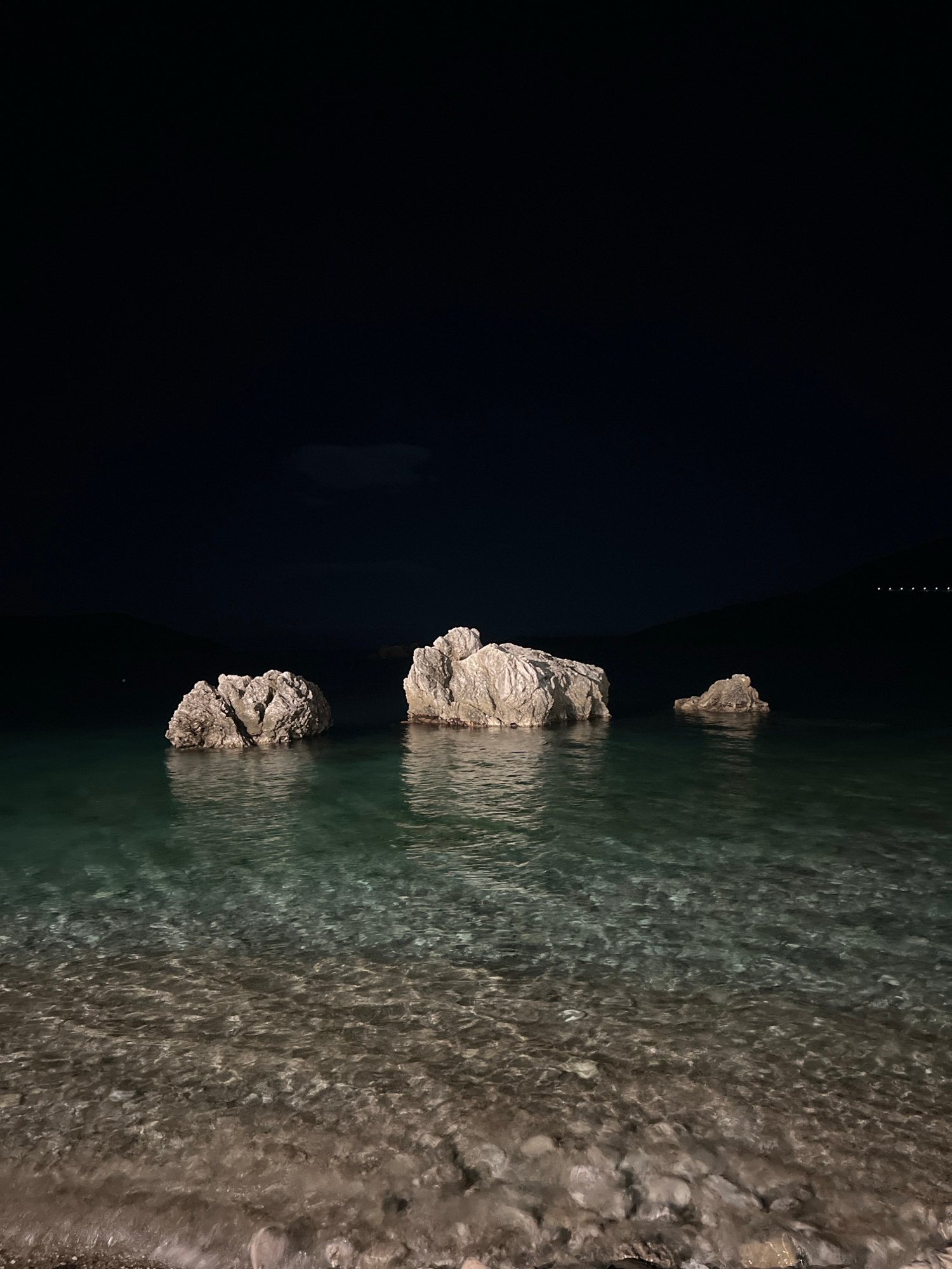 At nighttime in Herceg Novi, Montenegro, three large rocks jut out of the water near a rocky shore. The water is clear, reflecting the rocks and dim light. The land is dark on the left of the image, w…read more