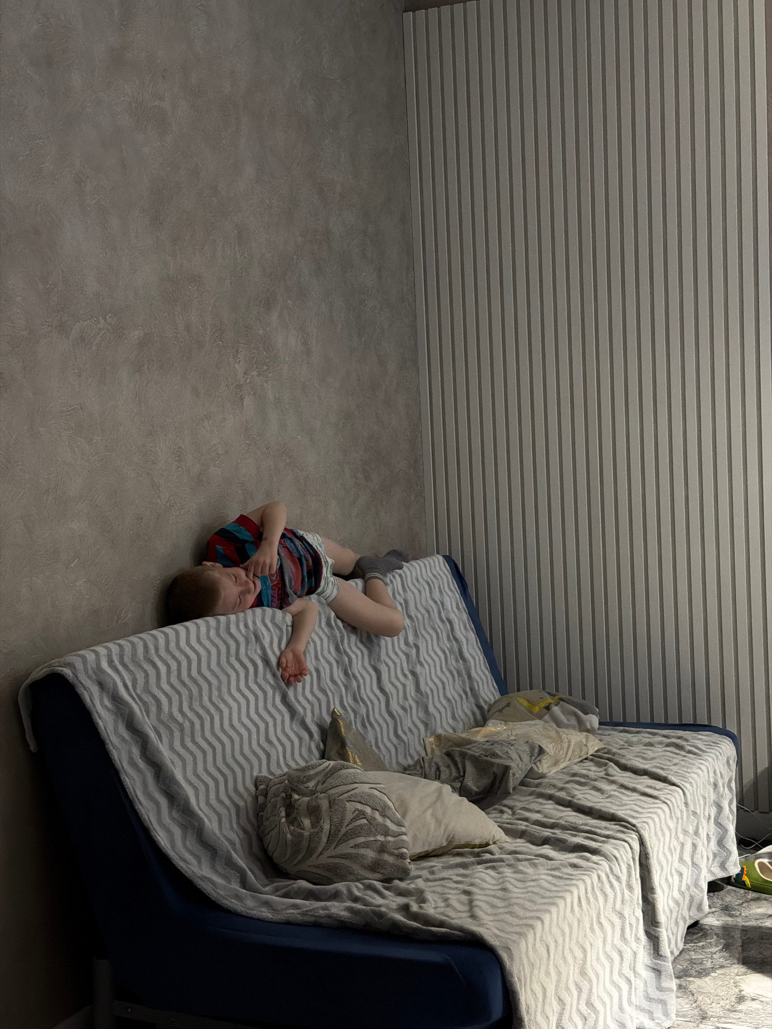 A child is lying on the floor next to a blue sofa in Rossiyskiy, Russia. The sofa is covered with a light gray blanket with a wavy pattern and has several pillows. The walls are covered with horizonta…read more