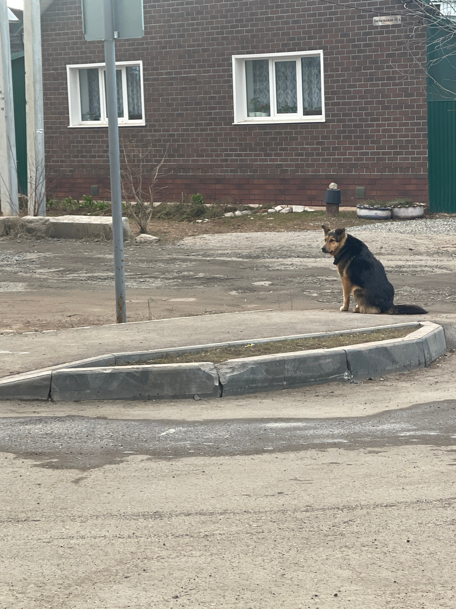 The image shows a street scene in Izhevsk, Russia, featuring a German Shepherd dog standing on the edge of the curb. The dog is black and tan, facing to the left of the frame. The curb is made of conc…read more