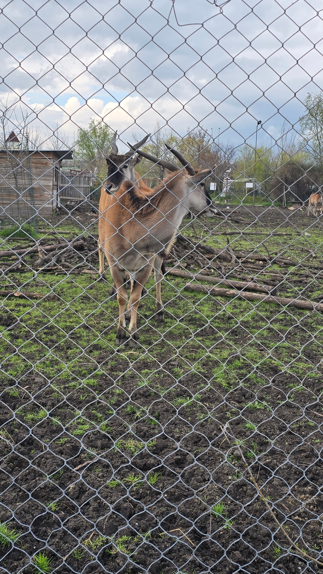 The image shows a pair of elands in an enclosure at the Burgas Zoo in Burgas, Bulgaria. The elands are light brown with dark faces and long, spiral horns. They stand behind a chain-link fence. The groβ¦read more
