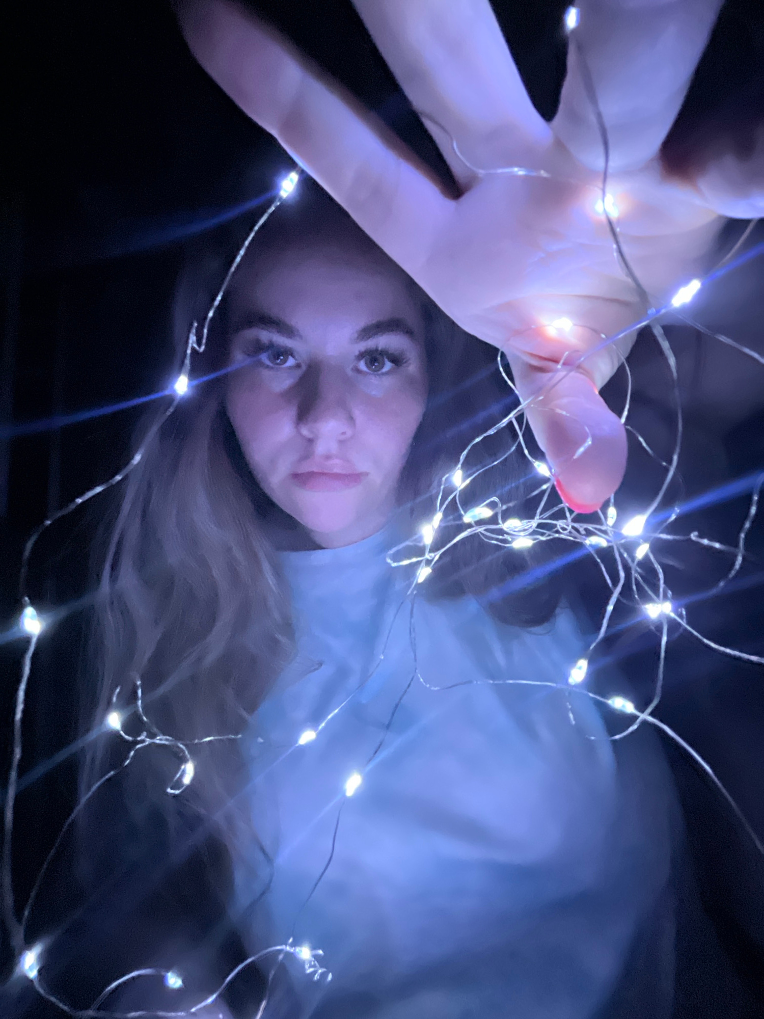 A woman is lying down in a darkened space with string lights illuminating her and her surroundings. The string lights are a bright white and are draped around her and held in her left hand. Her face i…read more