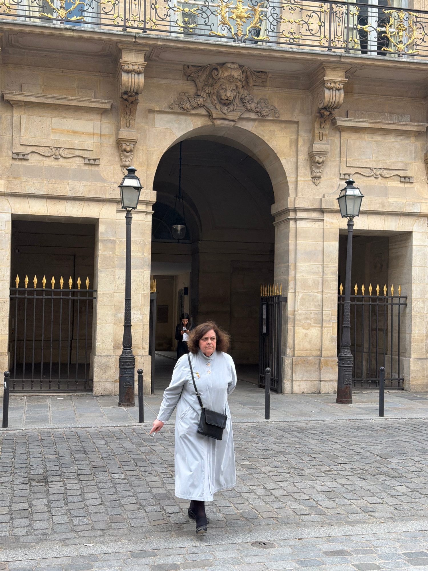 This vertical image depicts a woman standing on a cobblestone street in front of a grand stone building, characteristic of Parisian architecture. The woman, with shoulder-length brown hair, is wearing…read more