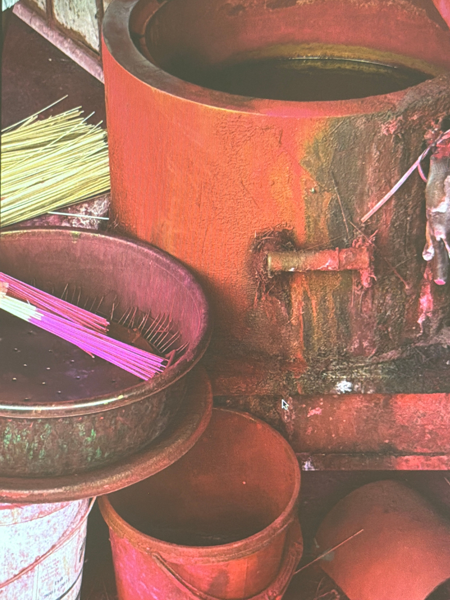 The image shows an arrangement of cylindrical objects and incense in Đà Nẵng, Vietnam. Dominating the composition are several large, reddish-brown cylindrical structures, possibly industrial pipes or…read more