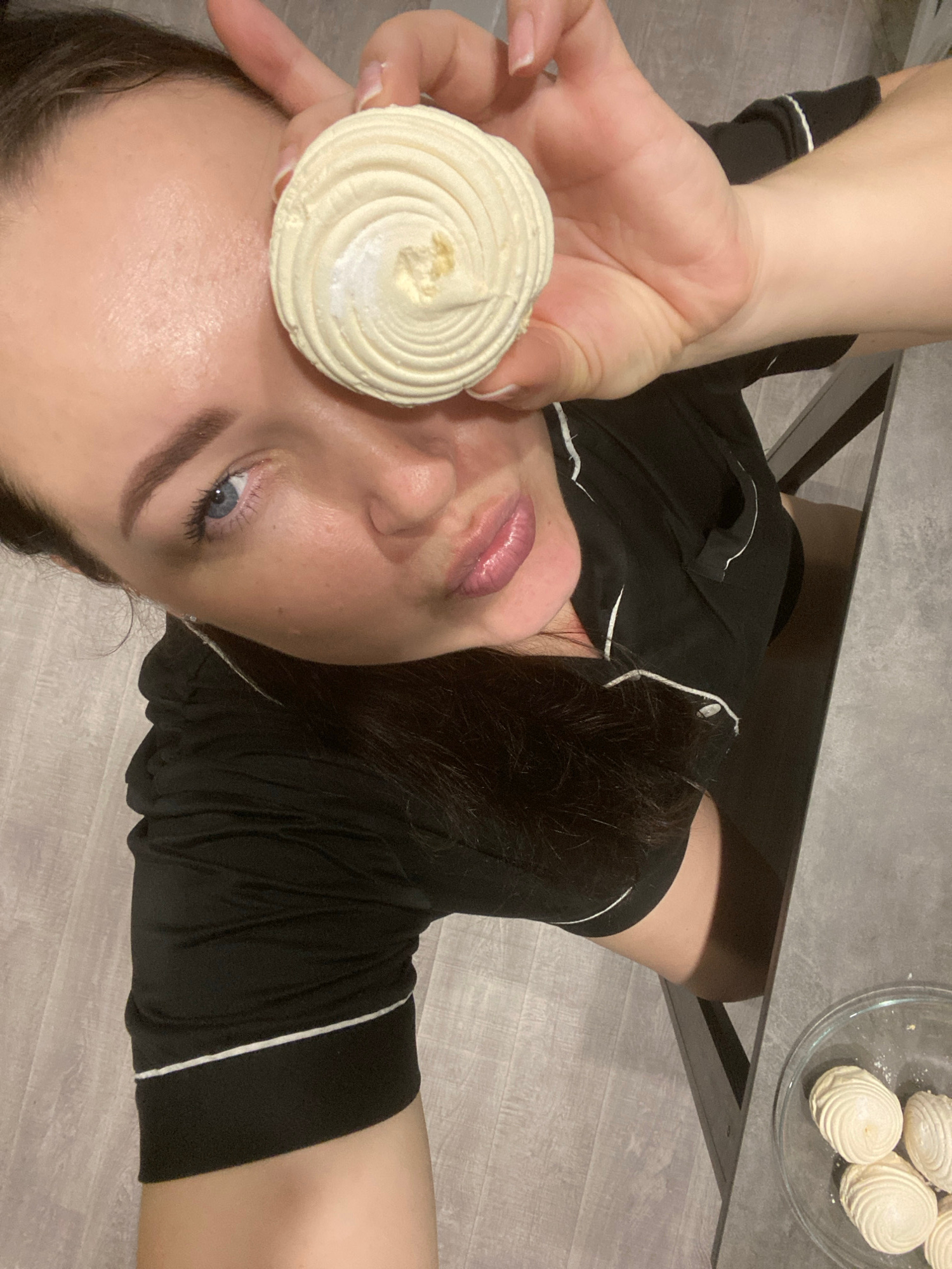 A woman is holding up a meringue in front of her face in an indoor setting. She is wearing black pajamas with white piping. A glass bowl with several other meringues is visible on a gray tabletop. The…read more