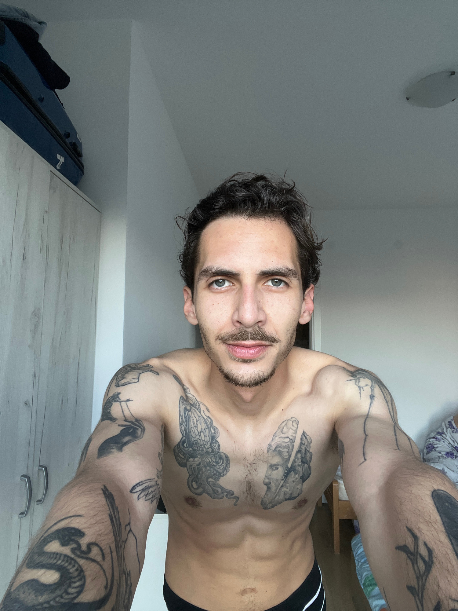 The image depicts a shirtless man with tattoos on his chest and arms. He has dark hair, a mustache, and light eyes. He is wearing black underwear. The background includes a white wall, a suitcase, and…read more