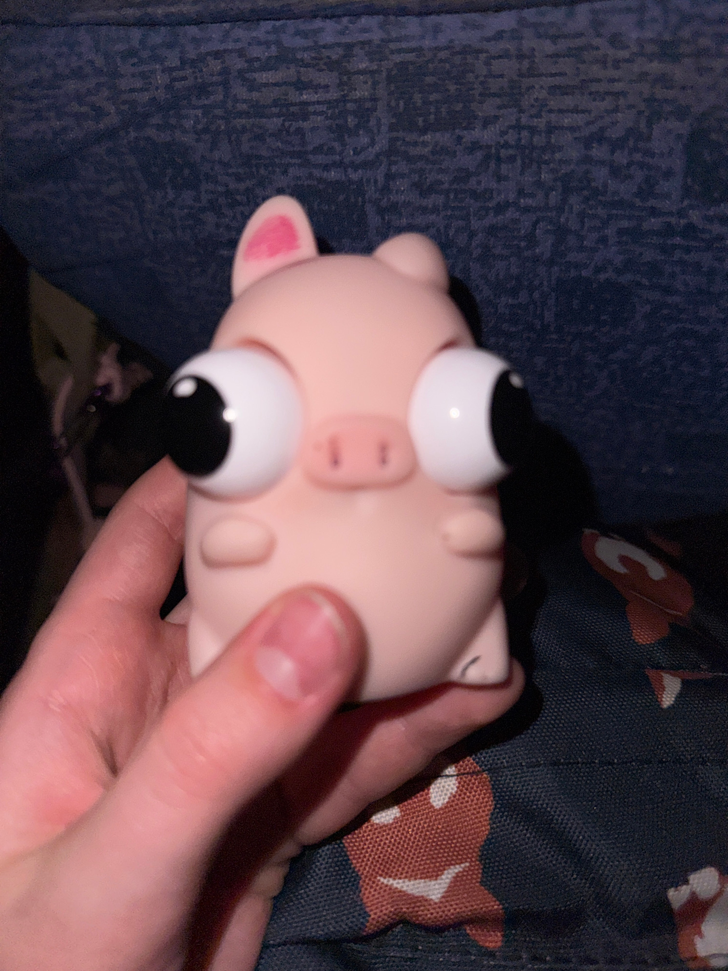 A person is holding a pink, toy pig in their hand. The pig has oversized, cartoonish eyes. The background includes a blue, textured surface and a patterned material with reddish-brown and white shapes…read more
