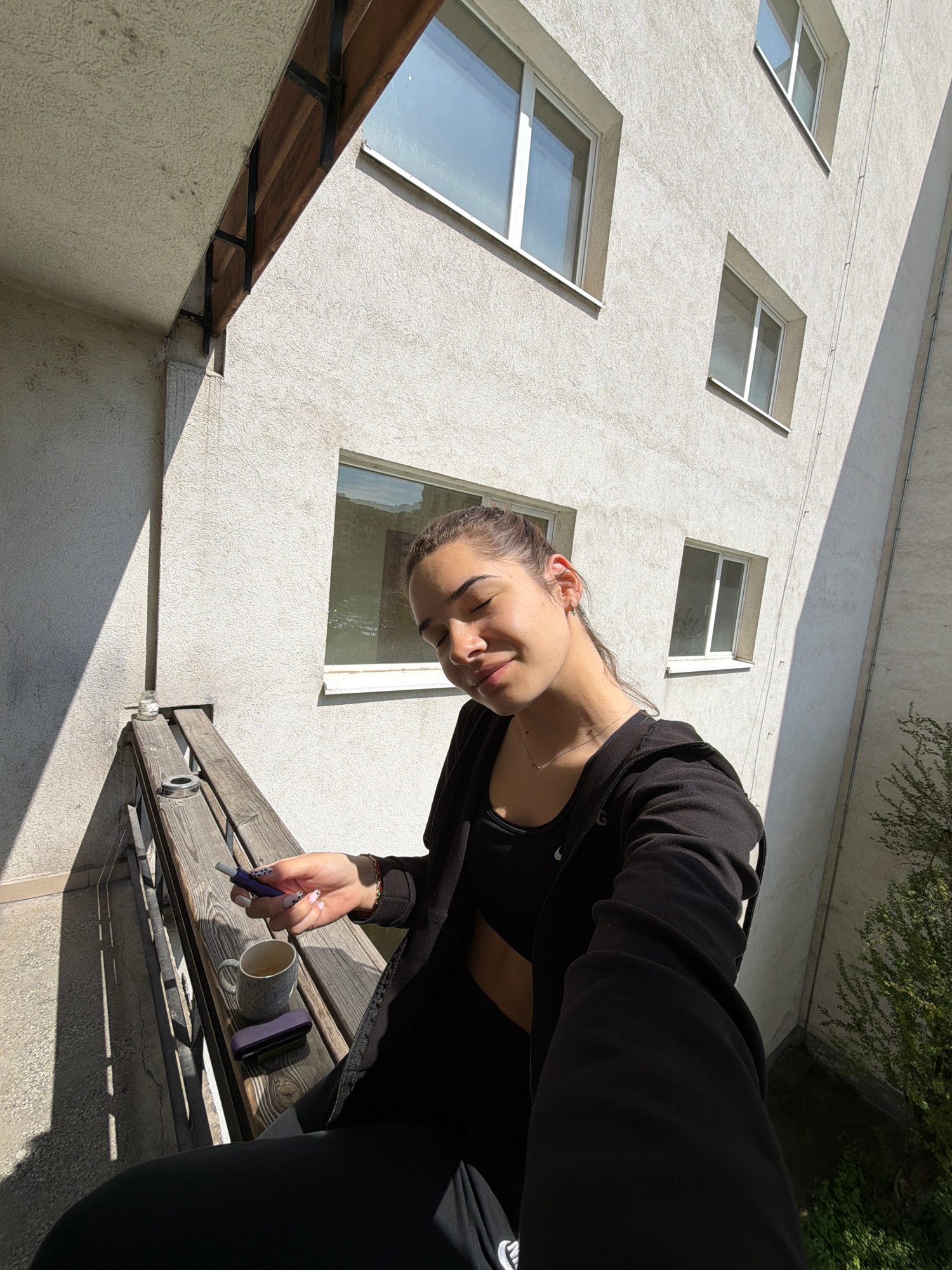 The image, taken from a low angle, depicts a woman standing on a balcony or terrace outside of a building, holding a pen. She wears black athletic clothing with a black jacket. A coffee mug and a smal…read more