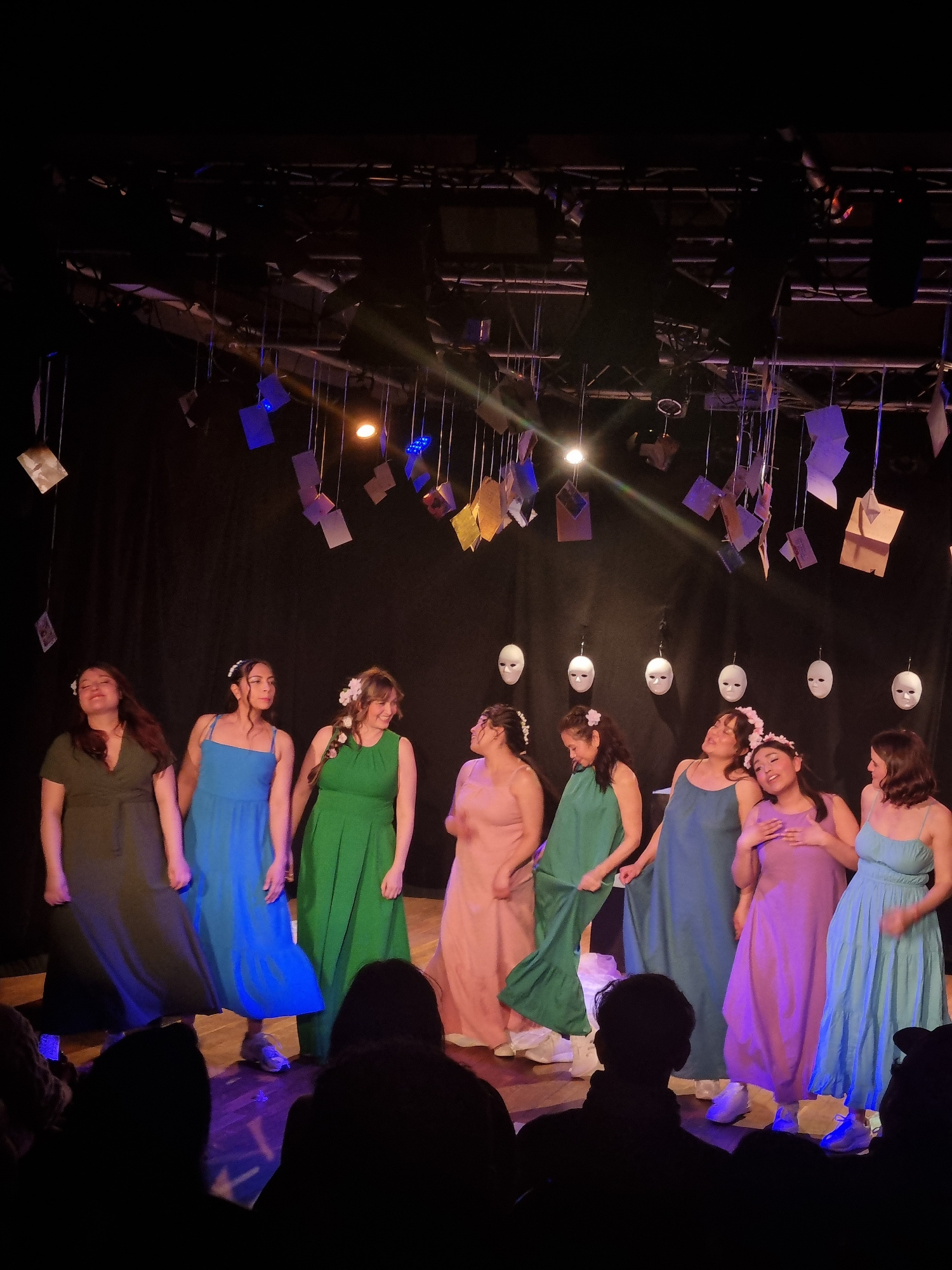 Onstage in Saarbrücken, Germany, seven women wearing pastel-colored dresses and floral headpieces lie in a line. A suspended rig to the left features papers and lights. Hanging above them are white…read more