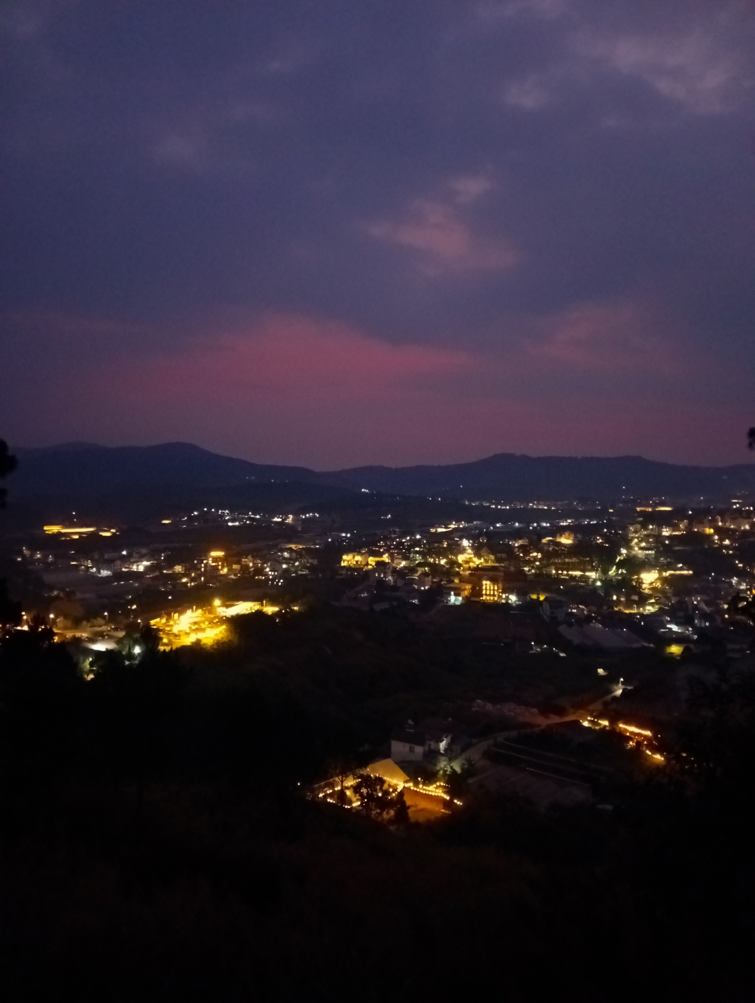 The image depicts a nightscape of Da Lat, Vietnam, from an elevated vantage point. The sky is a deep purple with some hints of pink near the horizon. Silhouetted hills or mountains are visible in the…read more