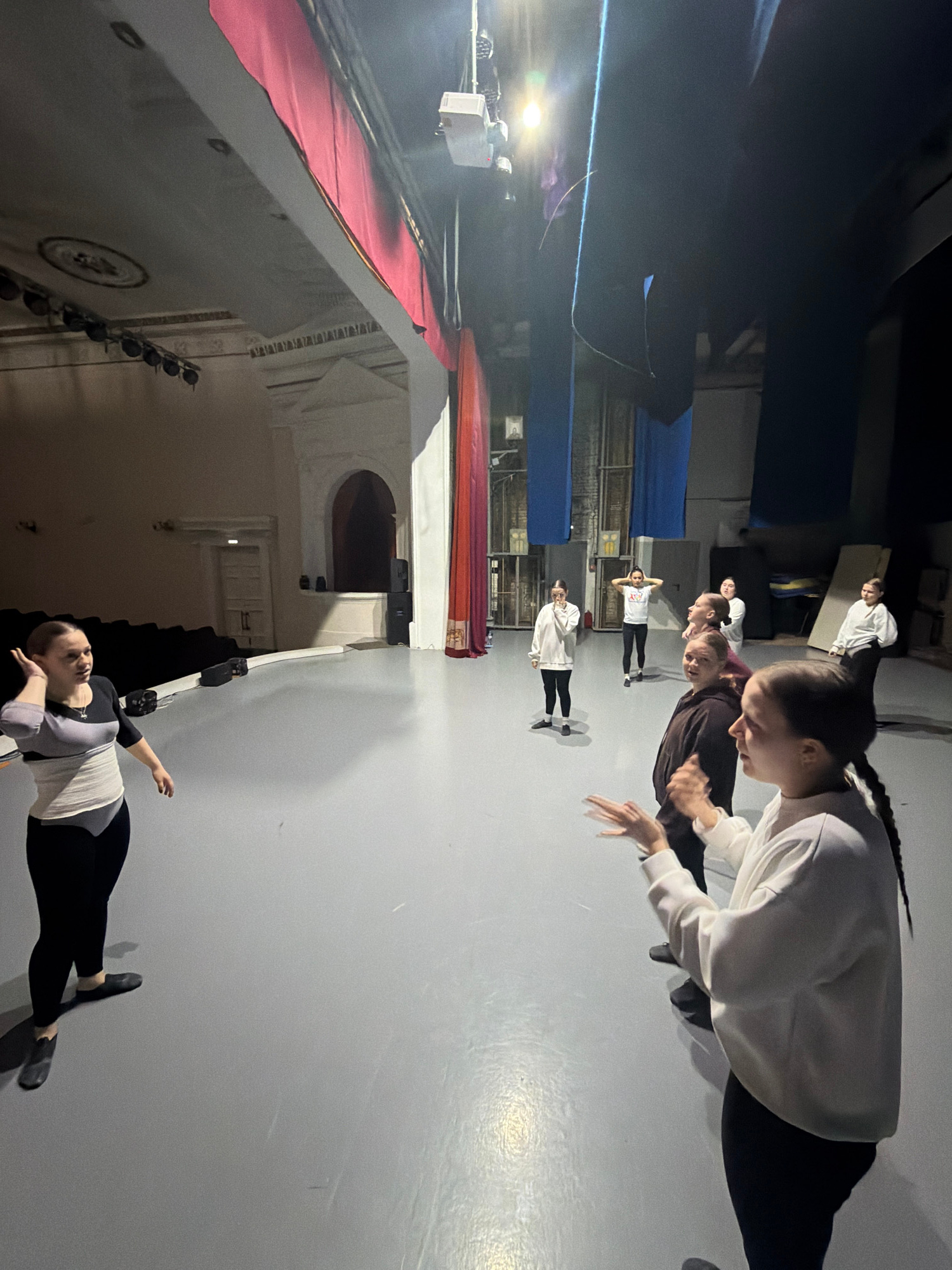 The image shows a group of dancers rehearsing in a theater in Perm, Russia. The dancers are aligned in a row on a stage and are performing some sort of choreographed movement, possibly involving theirβ¦read more