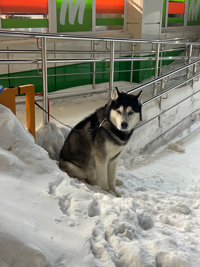 A Siberian Husky dog with a black, white, and grey coat and blue eyes is sitting in a snowdrift in front of a commercial building. The dog is wearing a dark-colored leash attached to a harness, with t…read more