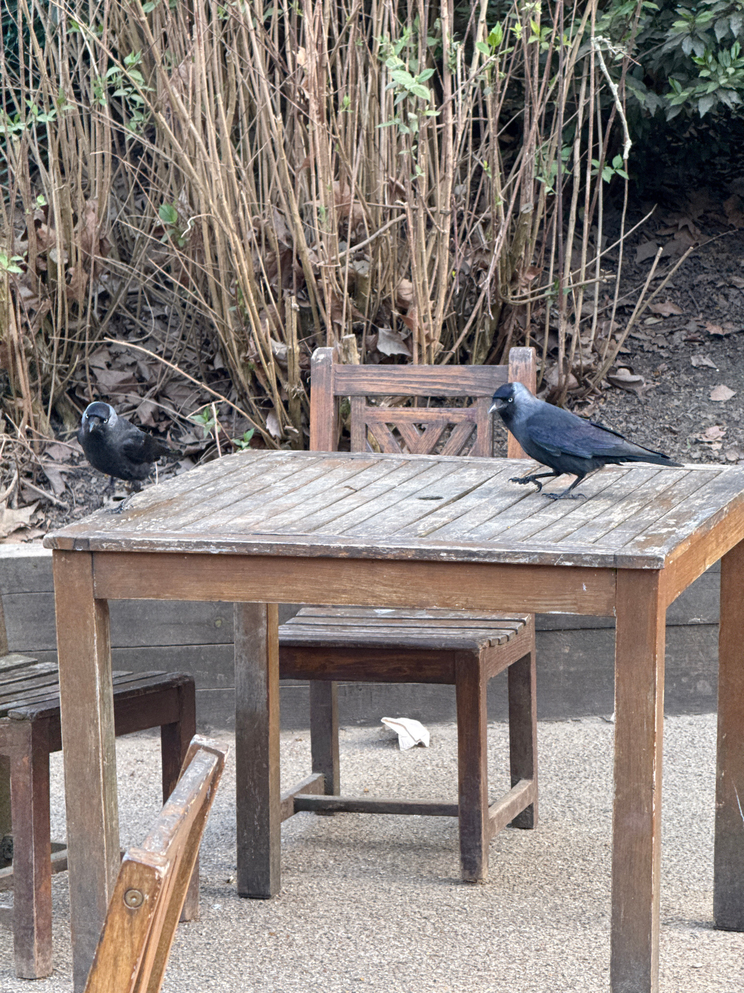 Two jackdaws perch on a wooden outdoor table and benches, viewed from above and slightly skewed. The table is positioned on a gray concrete or paved surface. Adjacent to the table is a bed of dry, tan…read more