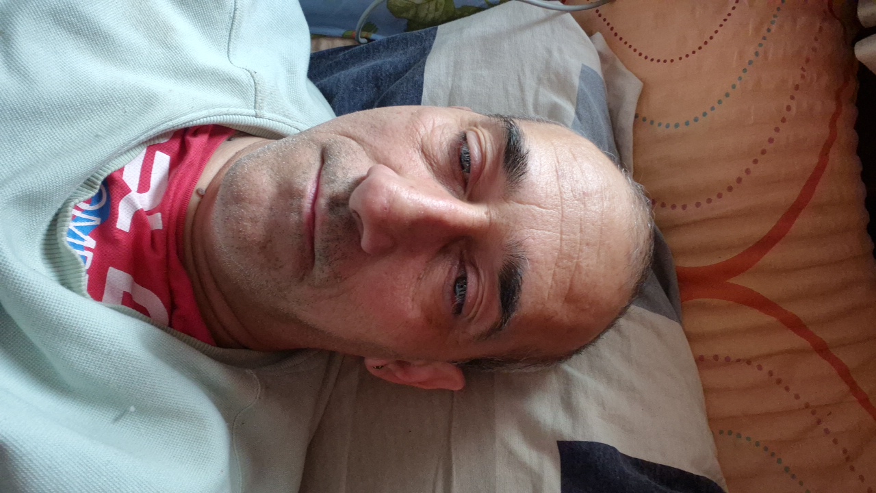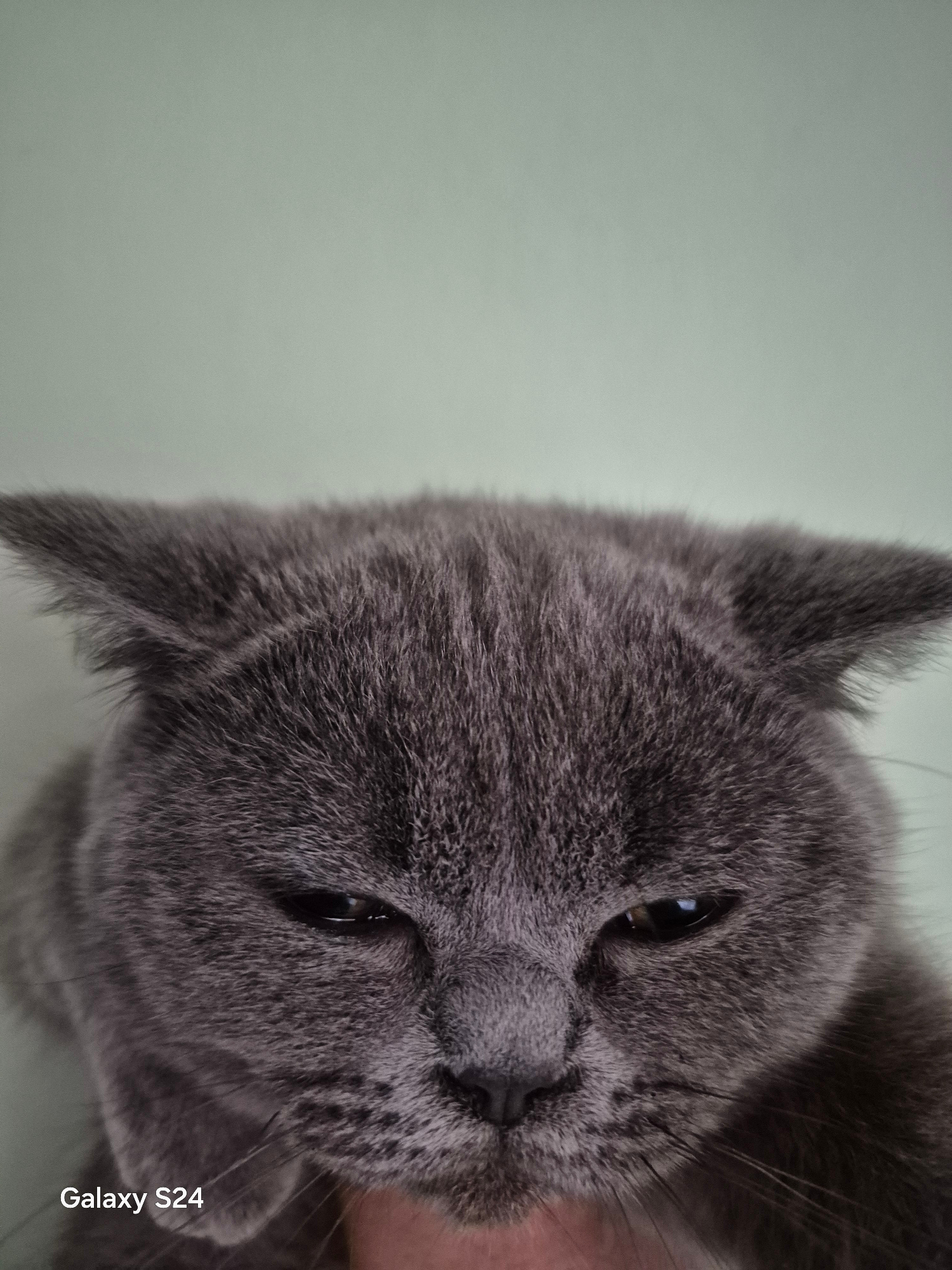 The image shows a close-up, slightly rotated view of a gray cat's face. The cat has short, dense fur and small, rounded ears. Its eyes are dark and reflective. Part of the cat's body extends towards t…read more