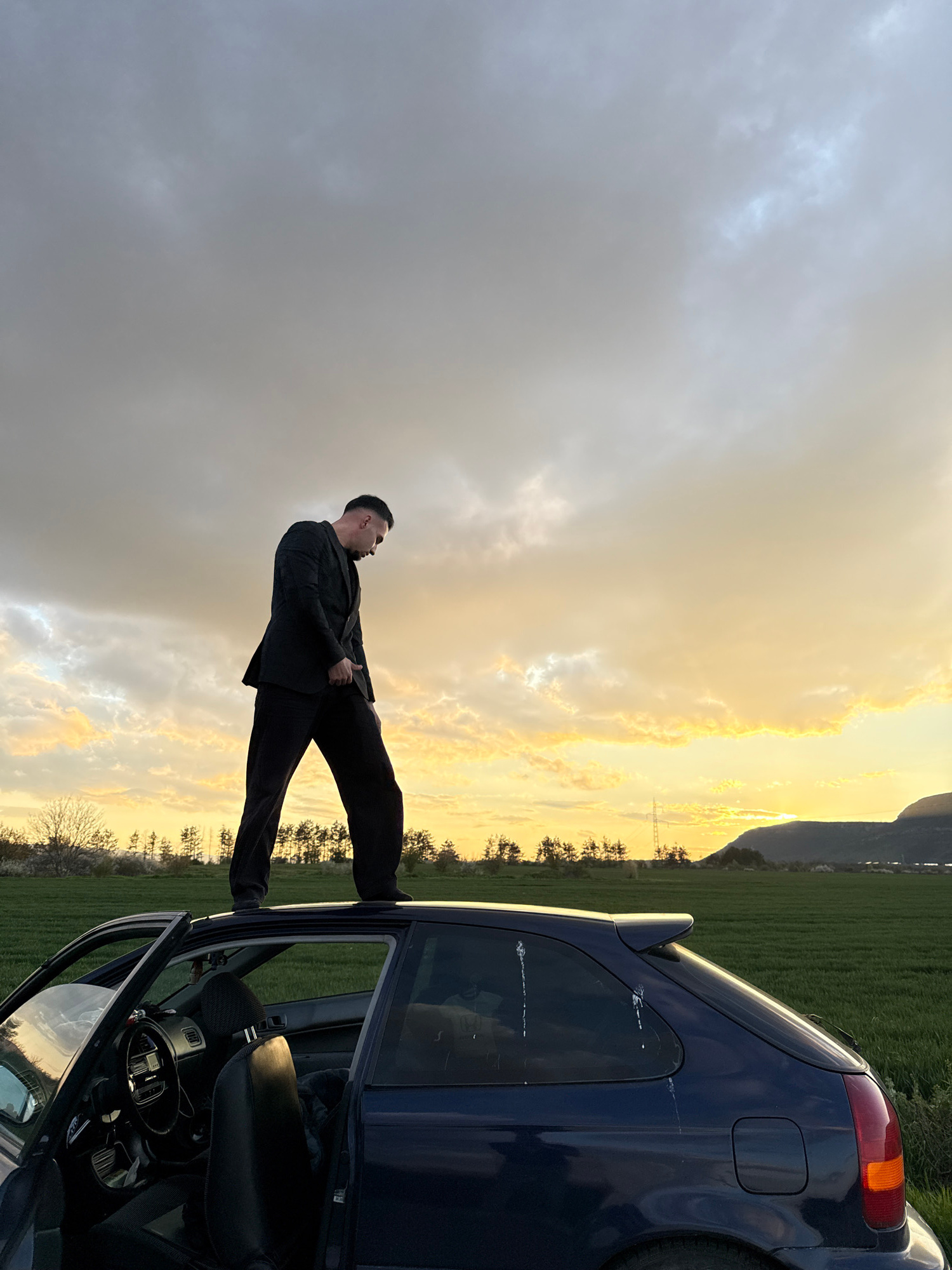 A photo taken in Shumen, Bulgaria depicts a man in a black suit standing on the open door frame of a dark blue car, presumably taking a picture with the sunset as backdrop. The car is parked on a rura…read more
