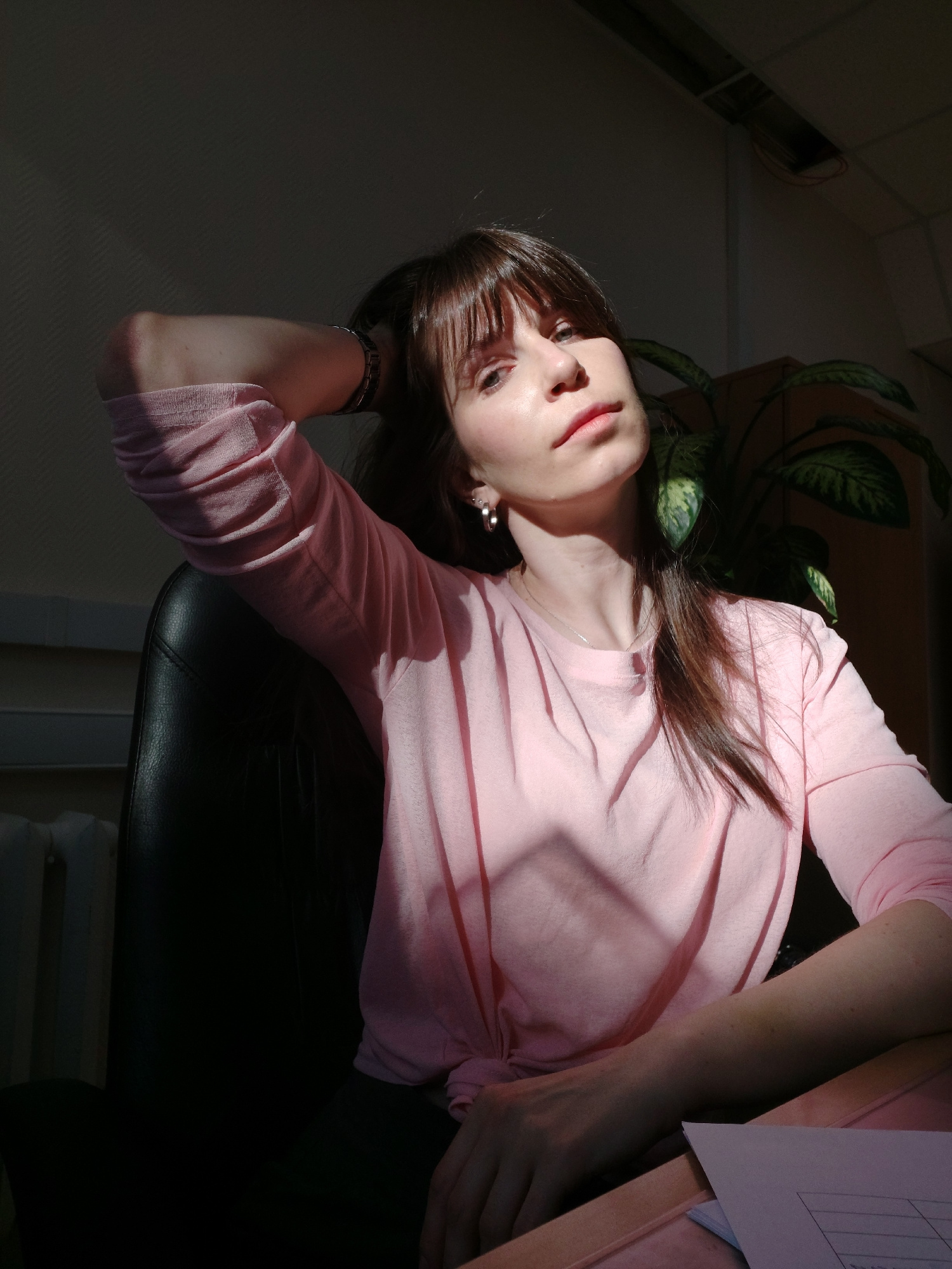 The image shows a woman with brown hair and fair skin. She is wearing a pink long-sleeved shirt and is sitting in a black chair. Her left arm rests on the chair while her right arm is bent. There is a…read more