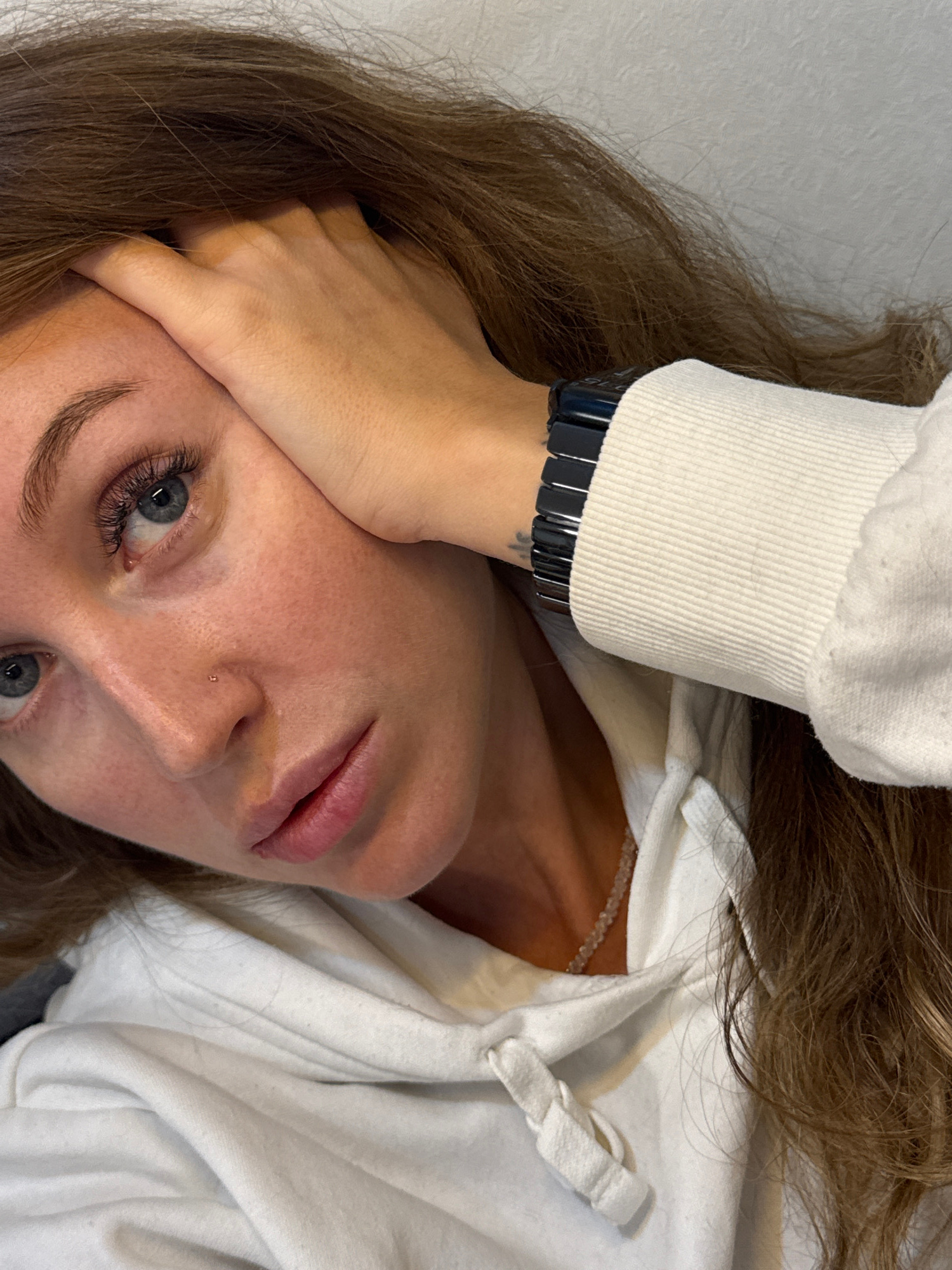 A woman with light brown hair and fair skin is lying down, angled towards the camera. She's wearing a white hooded sweatshirt. Her left hand is positioned near her face. She has blue eyes and a small…read more
