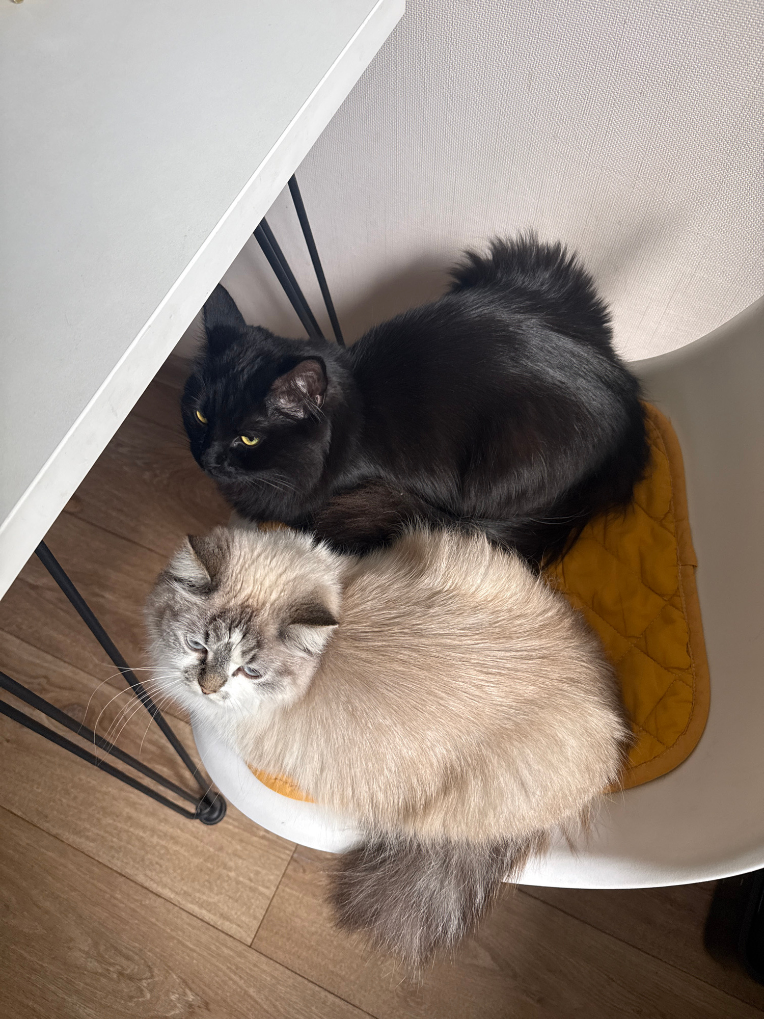 An overhead shot depicts a black cat and a light-colored cat resting on a yellow cushion in a white chair. The floor is wood. Part of a white cabinet is visible. There is no evidence to suggest this p…read more