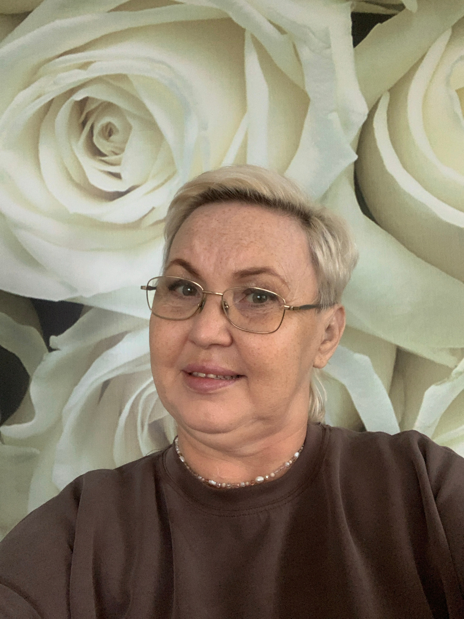 A woman with short blonde hair and glasses is seen in a close-up headshot. She is wearing a dark brown shirt and a beaded necklace. The background is a wall covered in a pattern of large, white roses.…read more