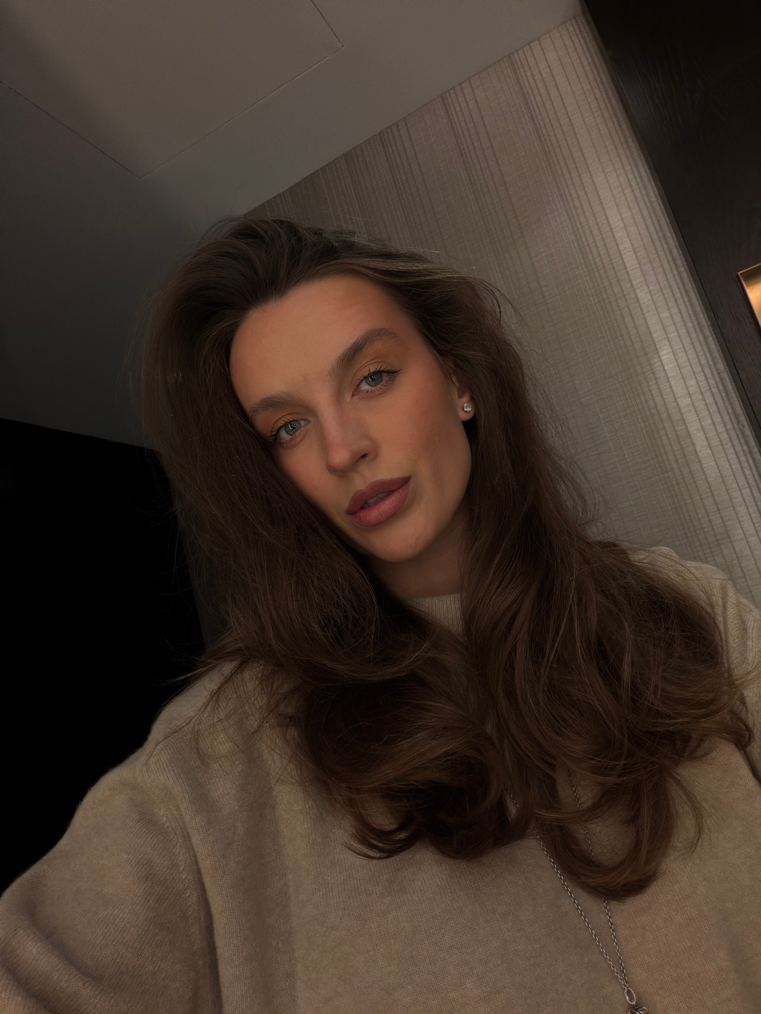A young woman with long brown hair is the focal point of the image. She is wearing a beige sweater and a small earring is visible on her left ear. A silver chain is draped over her shoulder and sweate…read more