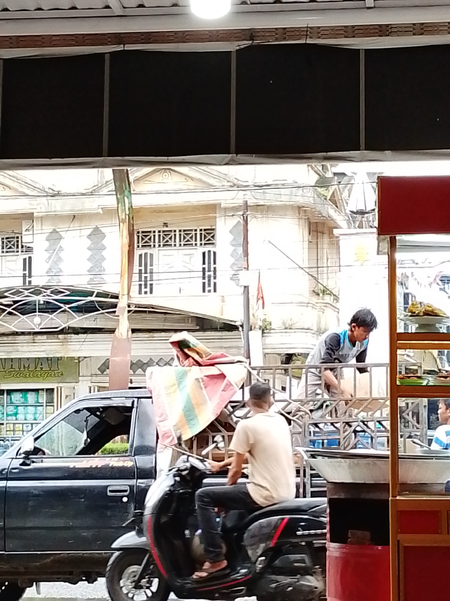 The image captures a bustling street scene in Lhokseumawe, Indonesia, during daytime. In the foreground, a man wearing a beige shirt and dark pants rides a black scooter, facing away from the viewer.…read more