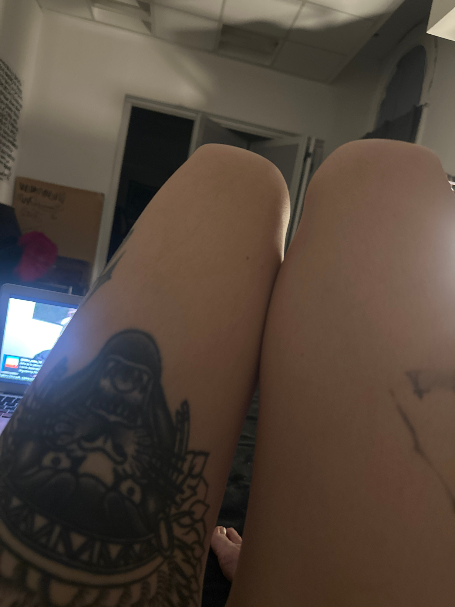 A close-up, tilted shot depicts a person's thighs with tattoos. The upper thigh has a faint, undefined tattoo. The lower thigh features a detailed tattoo of a stylized image. A laptop screen is visiblβ¦read more