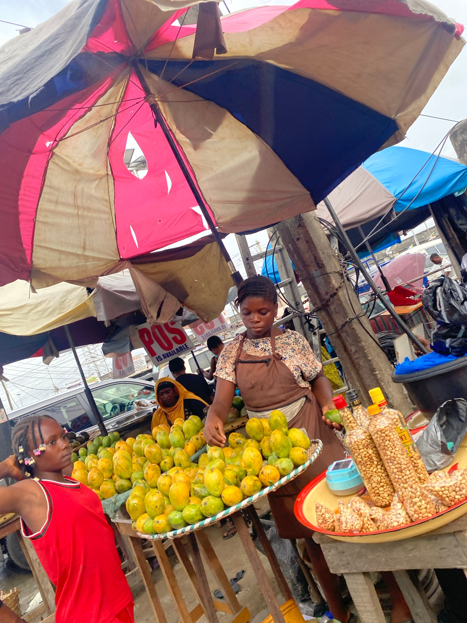 An eye-level, slightly rotated outdoor shot reveals a busy street scene in Lagos, Nigeria. The scene is bustling with activity centered around a street vendor selling fruits and peanuts. A young woma…read more