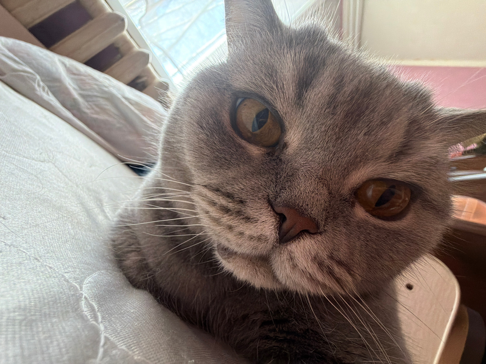 A close-up, low-angle photograph captures the face of a grey domestic cat, likely a British Shorthair, looking directly at the viewer with an intense and curious expression. The cat's striking amber-g…read more