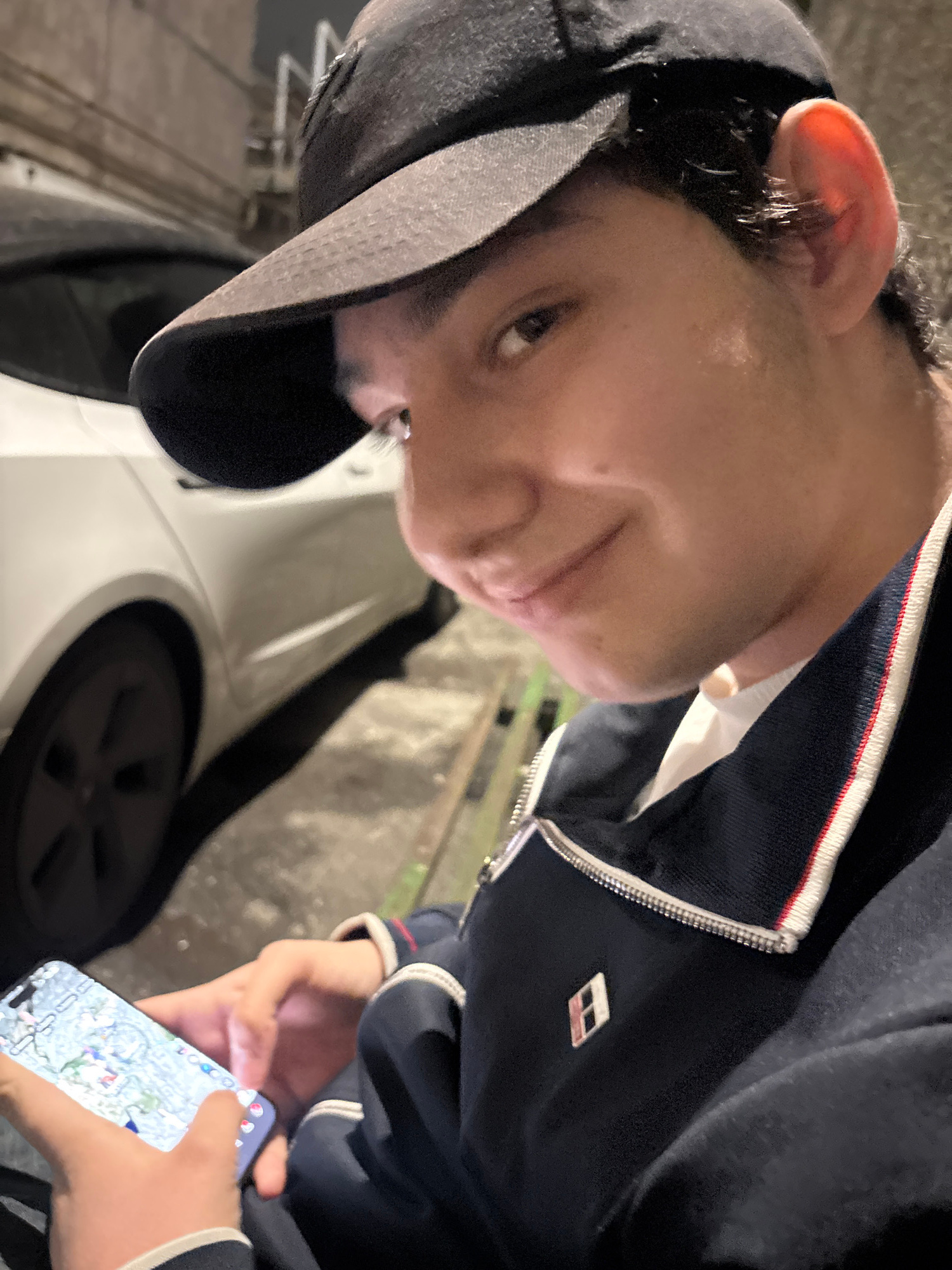 A person wearing a dark jacket with white and red trim and a black baseball cap is holding a phone in their hands. The phone screen displays a map-like interface with various icons. The person is posi…read more