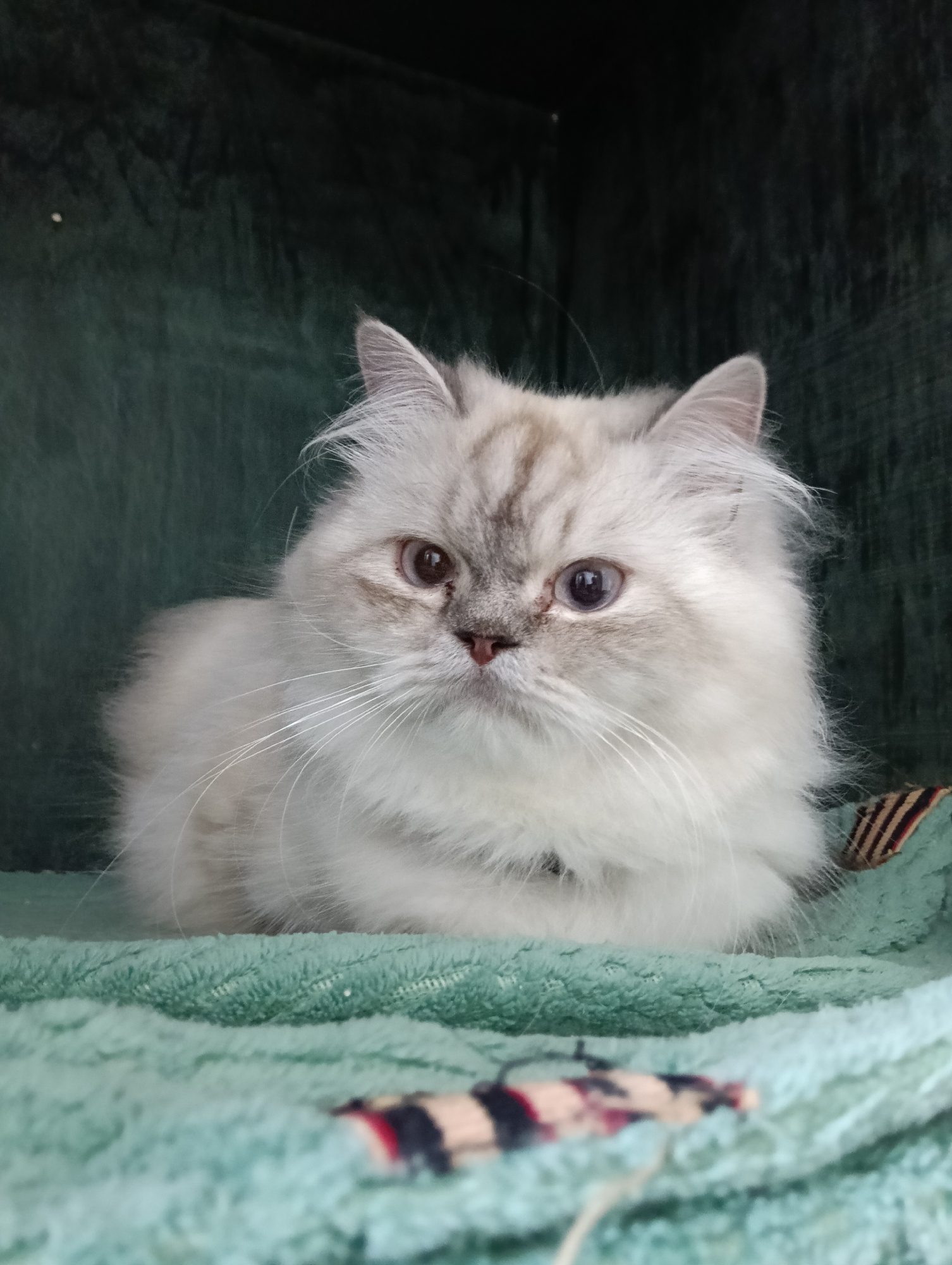 The scene, located in Nairobi, Kenya, features a long-haired domestic feline, specifically a colorpoint cat with predominant cream to white fur and distinct greyish-brown tabby markings on its face an…read more