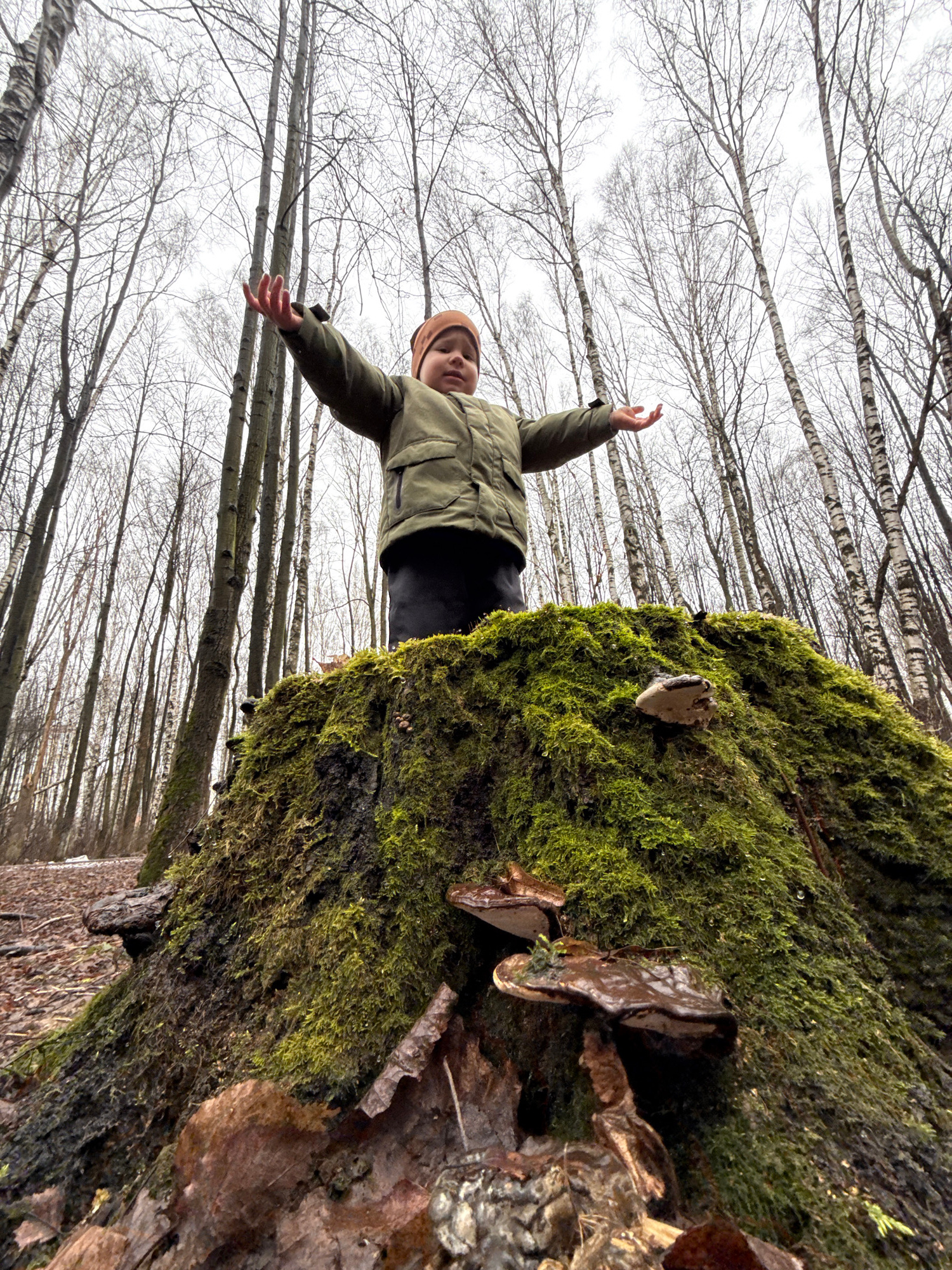 A person stands with arms outstretched near a tree trunk covered in green moss and fungi. The setting is a forest with bare trees visible in the background. The location is Unknown, Unknown.