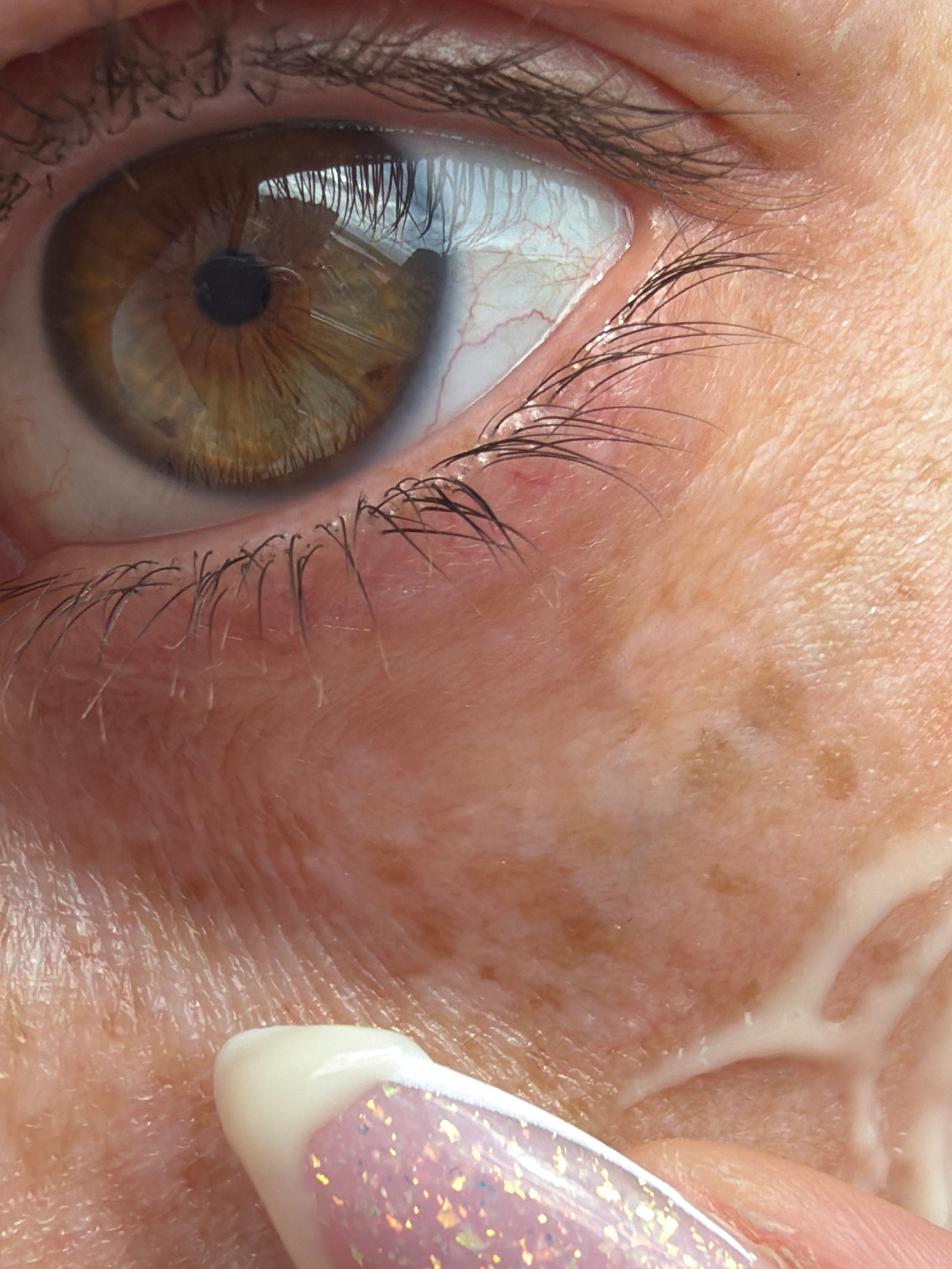 A close-up of a human eye, likely female, with hazel iris and surrounding skin showing signs of aging (wrinkles, freckles). Eyelashes are visible. A finger with a decorated nail (glitter and white tip…read more