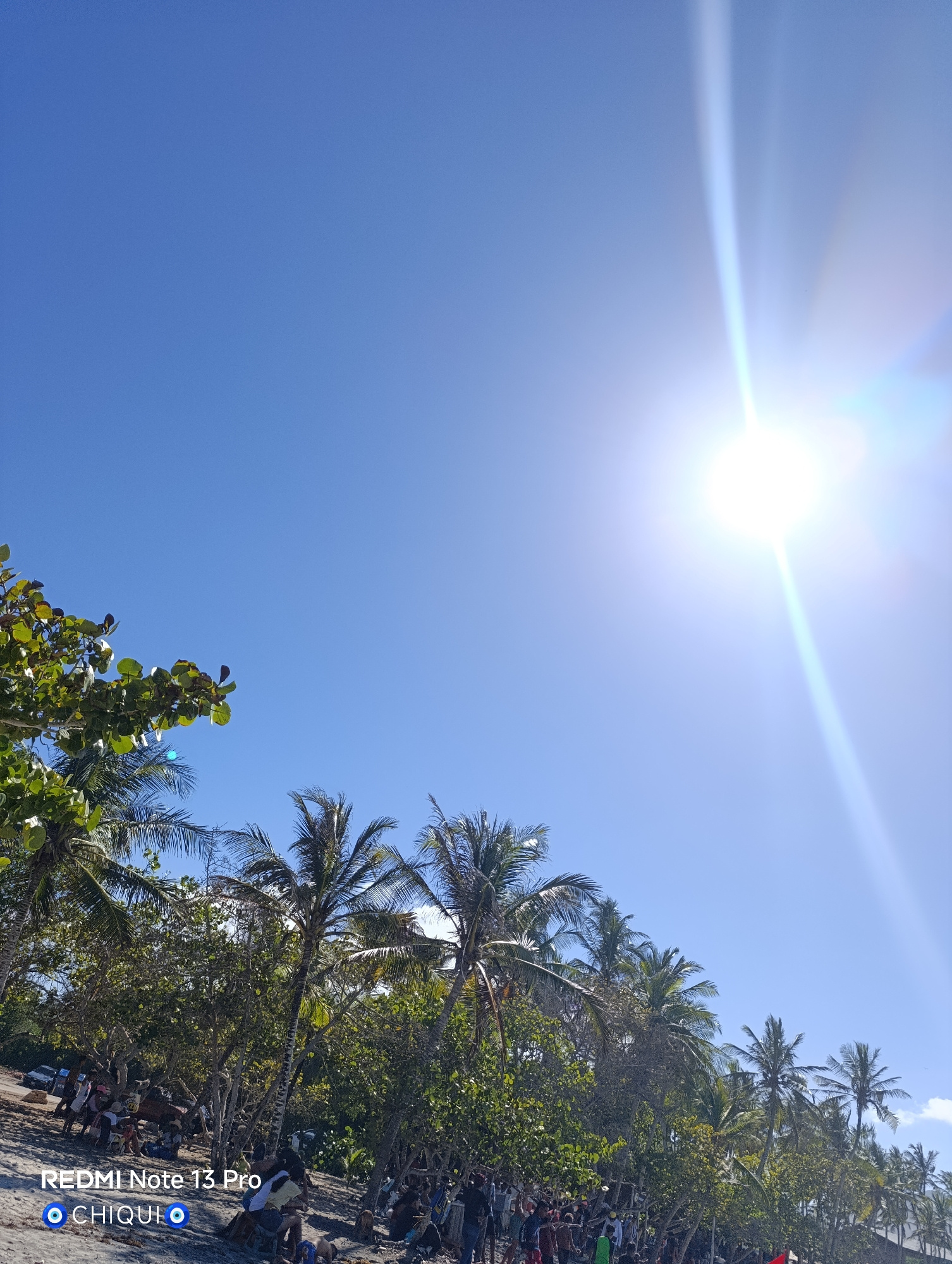 The image captures a vibrant scene at Playa Parguito, Venezuela, under a clear blue sky with a bright sun. In the foreground, a gathering of people is visible beneath lush tropical trees, predominantl…read more