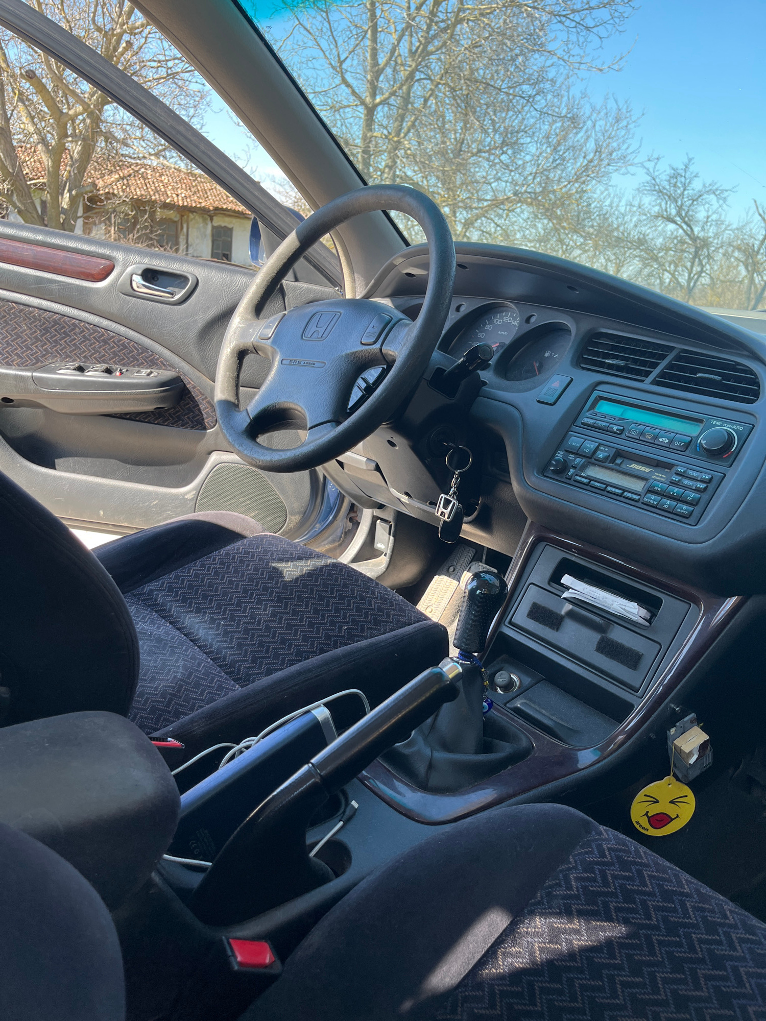 The interior of a car is shown. The car is likely a Honda Accord, based on the steering wheel logo. The dashboard features an aftermarket radio and a manual transmission. The car is parked, keys are i…read more