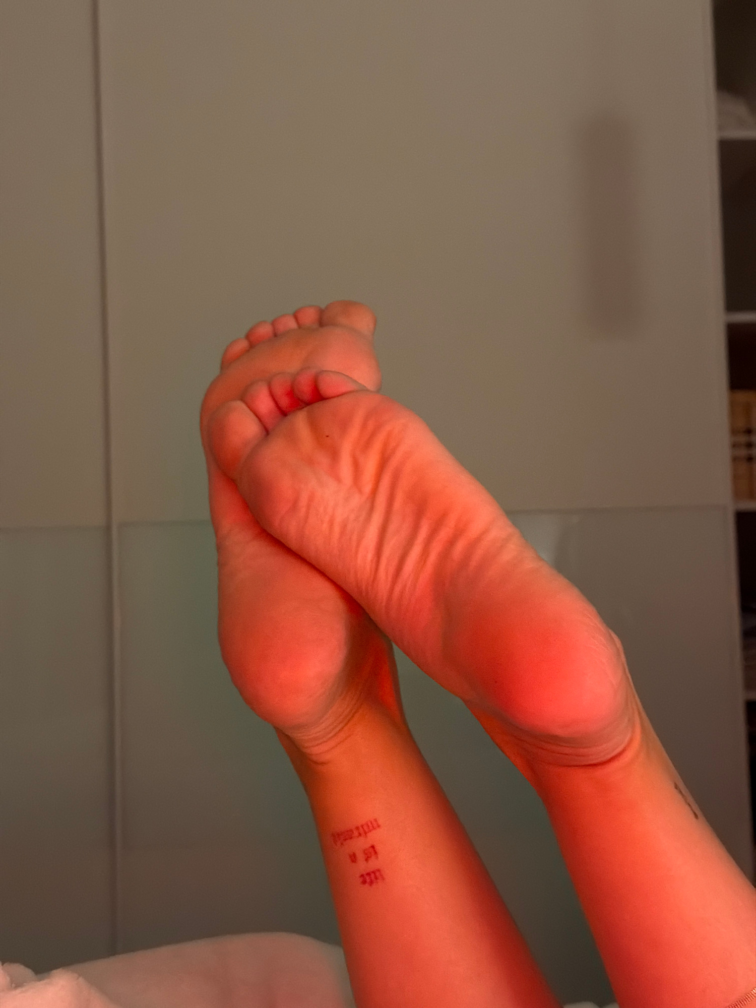 A close-up, horizontally-oriented shot shows a pair of bare feet crossed at the ankles, with the soles facing the viewer. A red tattoo is visible on the inner part of one ankle. The background appears…read more