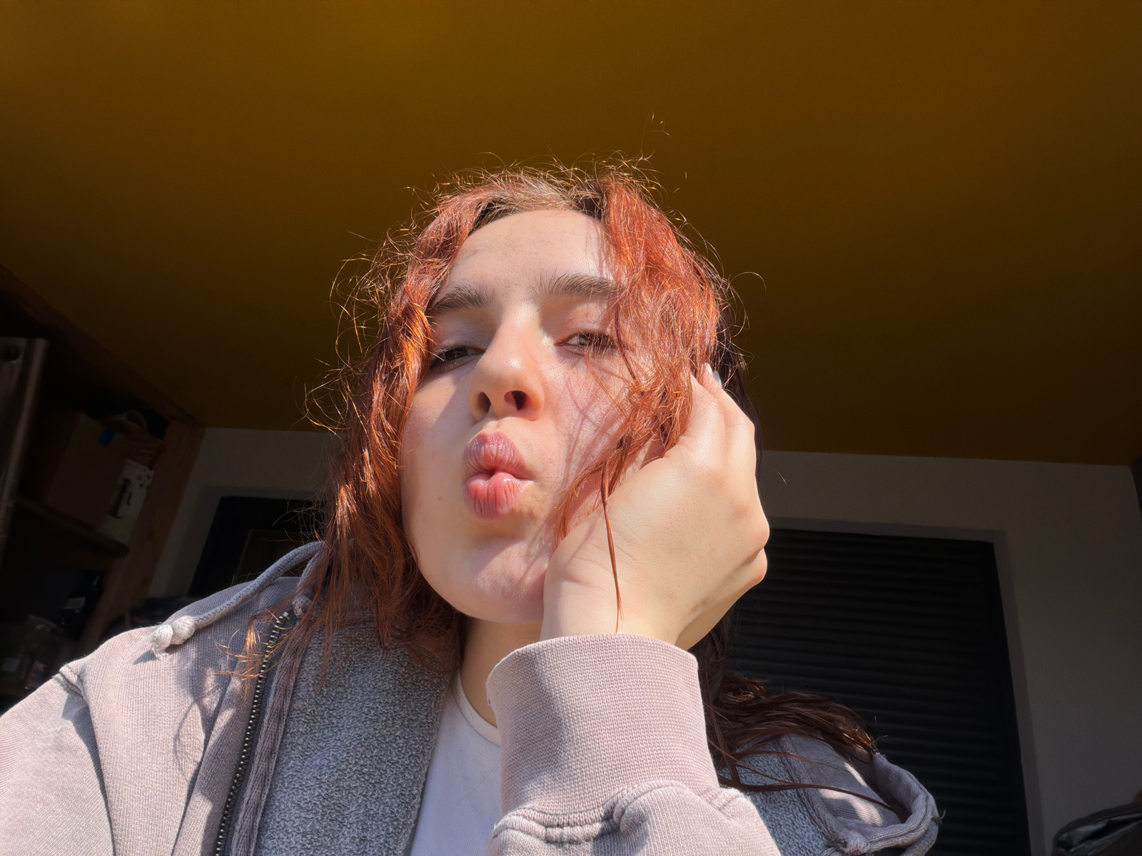 A woman with long, reddish-brown hair is seen from a low angle, with her head tilted upside down. She is wearing a gray hoodie. Her left hand is raised to her face, partially obscuring it. The backgro…read more