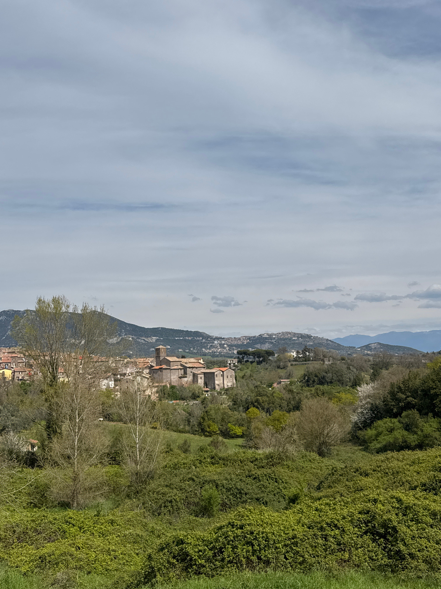The image depicts Rignano Flaminio, Italy. The scene includes a mountain range in the distance, with green, lush vegetation covering the landscape to the right. A small town with buildings featuring r…read more