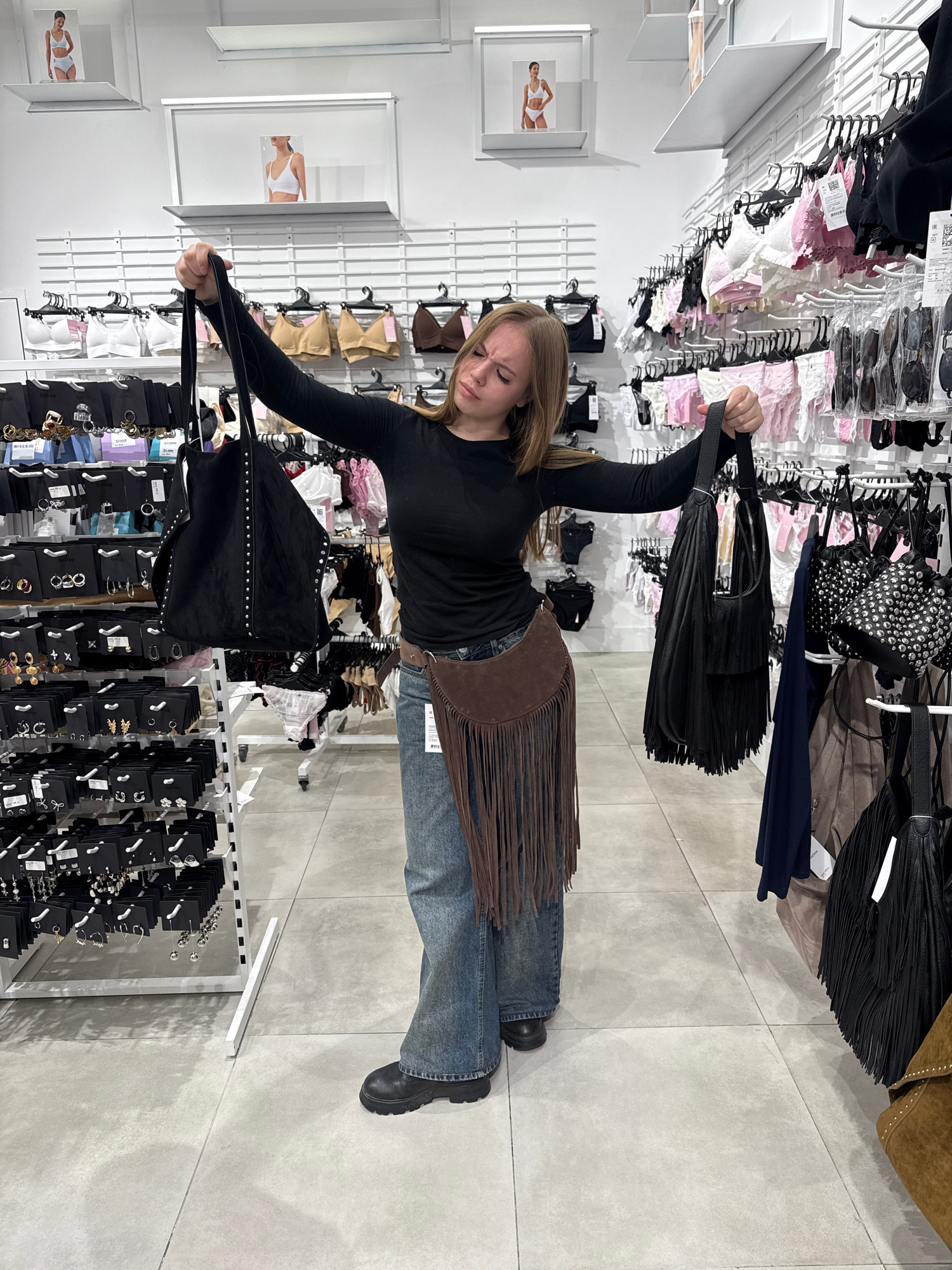 The image depicts a young Caucasian female standing within a retail store in Sochi, Russia. She is centrally positioned, facing the viewer with a deliberative or slightly exasperated expression, eyebr…read more