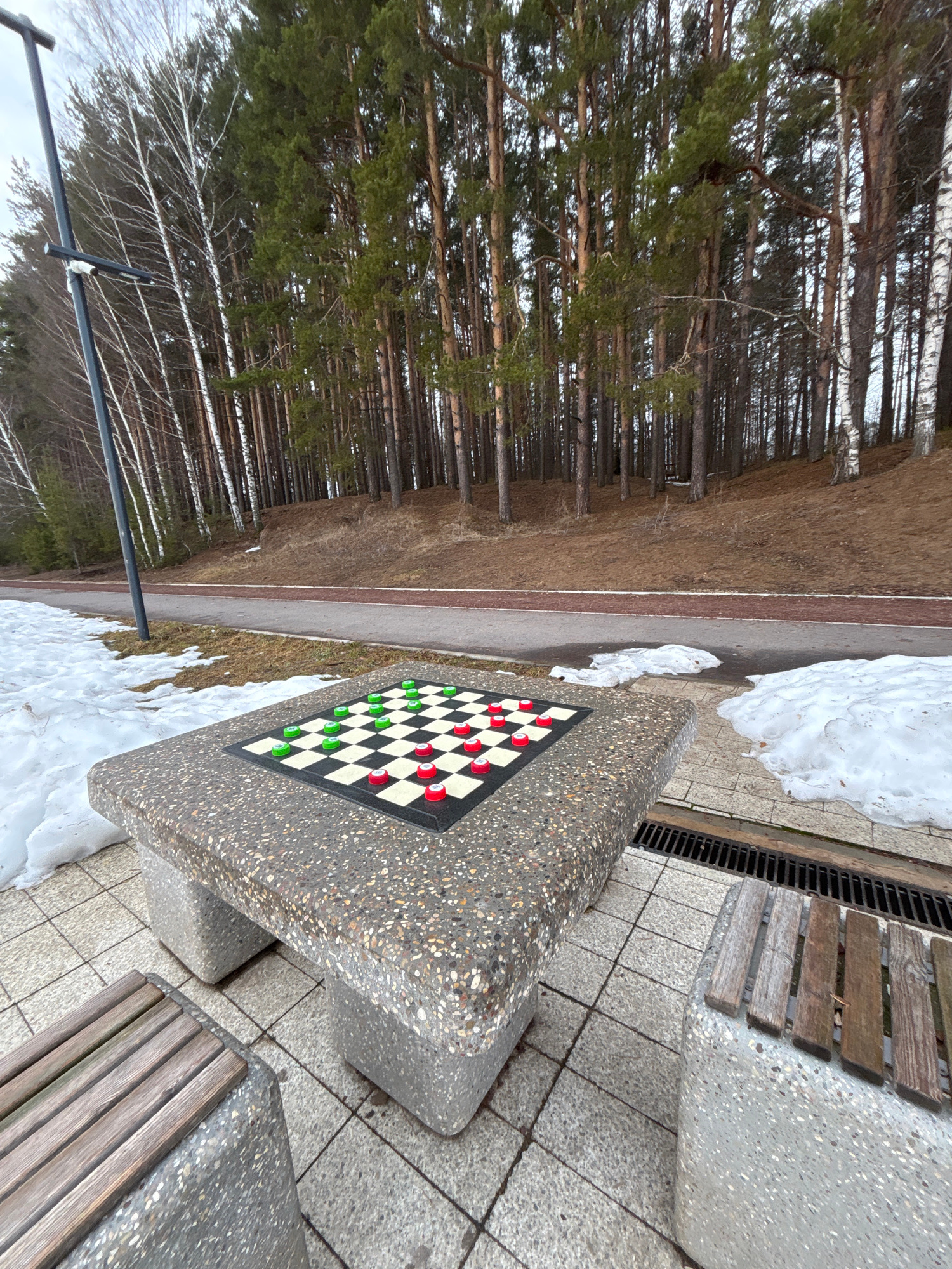 The image shows a checkers table in a park in Chaikovsky, Russia. The table is made of speckled concrete, with a black and white checkerboard inlay. Red and green checker pieces are arranged on the bo…read more