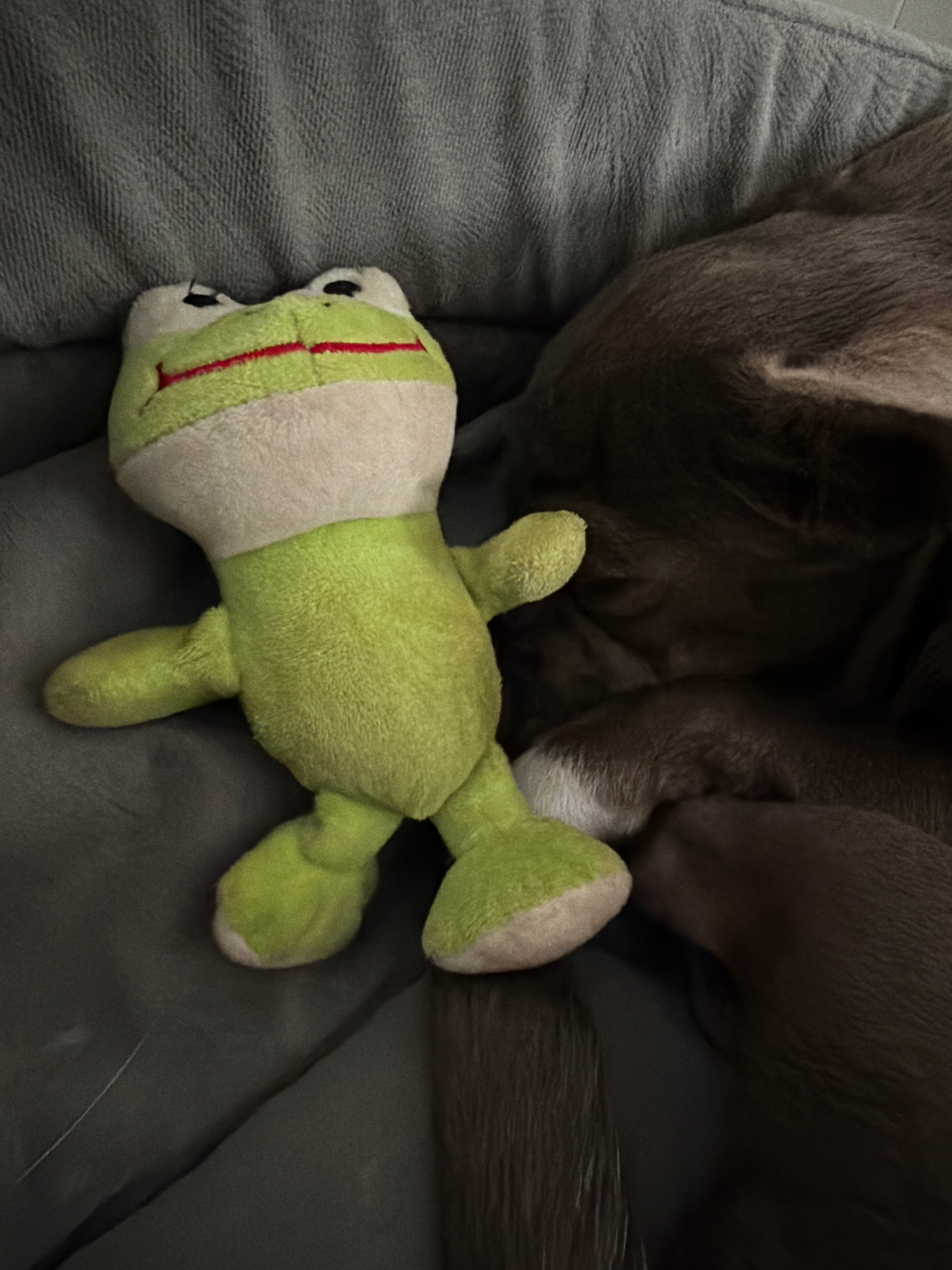 A stuffed green frog toy with a beige neck lies on a gray, cushioned surface. Above the toy is a dog, likely sleeping, with its brown fur visible in the upper half of the image. The scene is indoors,…read more