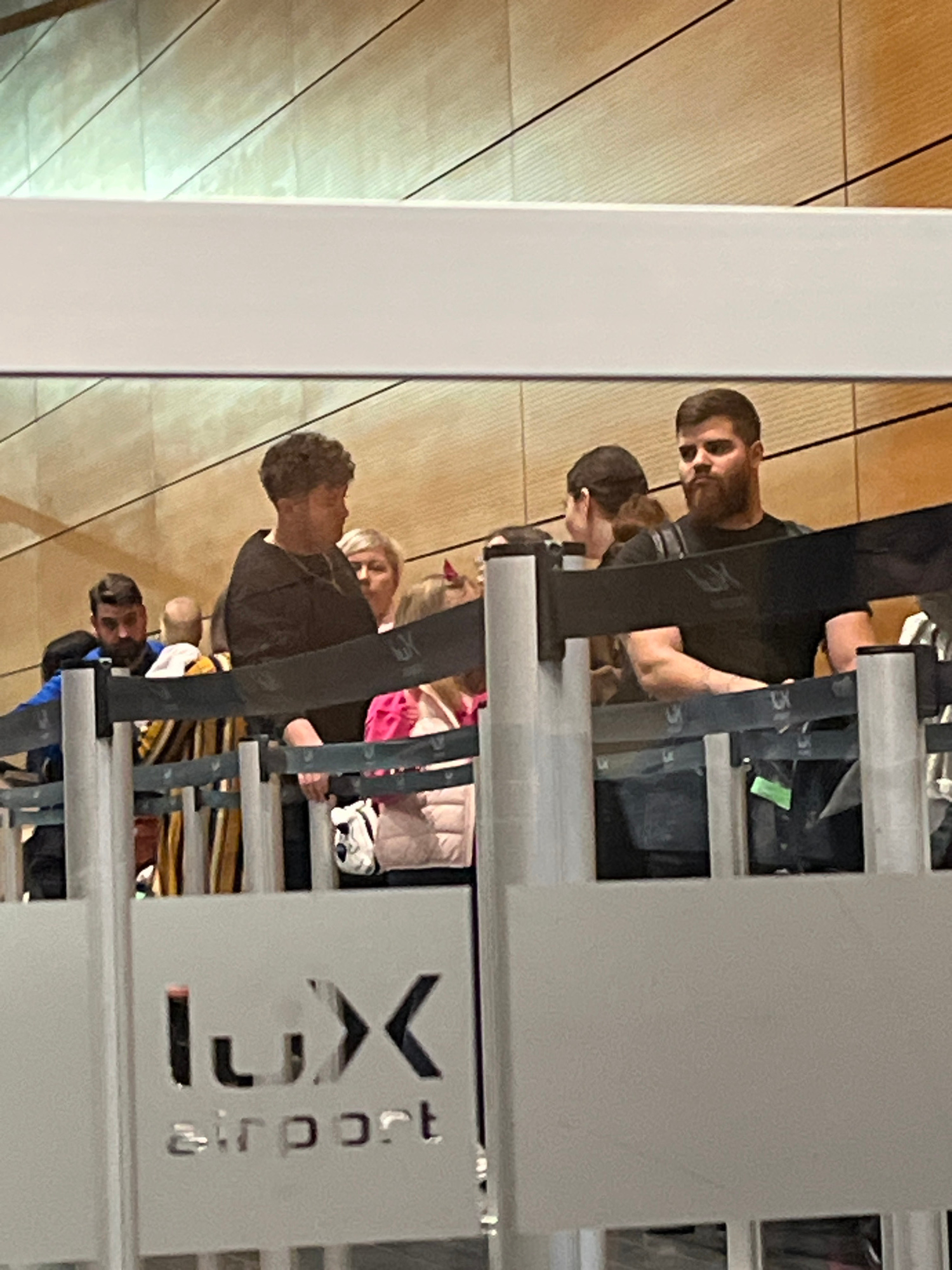 The image displays an indoor scene, likely at an airport, where several people are queuing. The perspective is slightly elevated, looking across a series of grey metal barriers that form the queue linβ¦read more