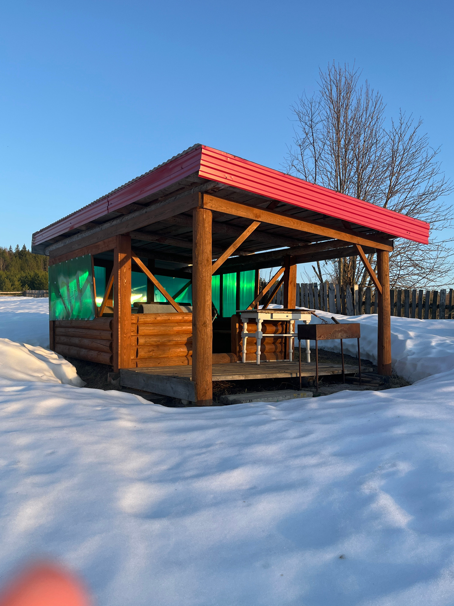 The image shows a wooden structure with a red metal roof in Большой Букор, Russia. The structure has green translucent panels on the sides. There's snow on the ground next to the structure, and a bare…read more