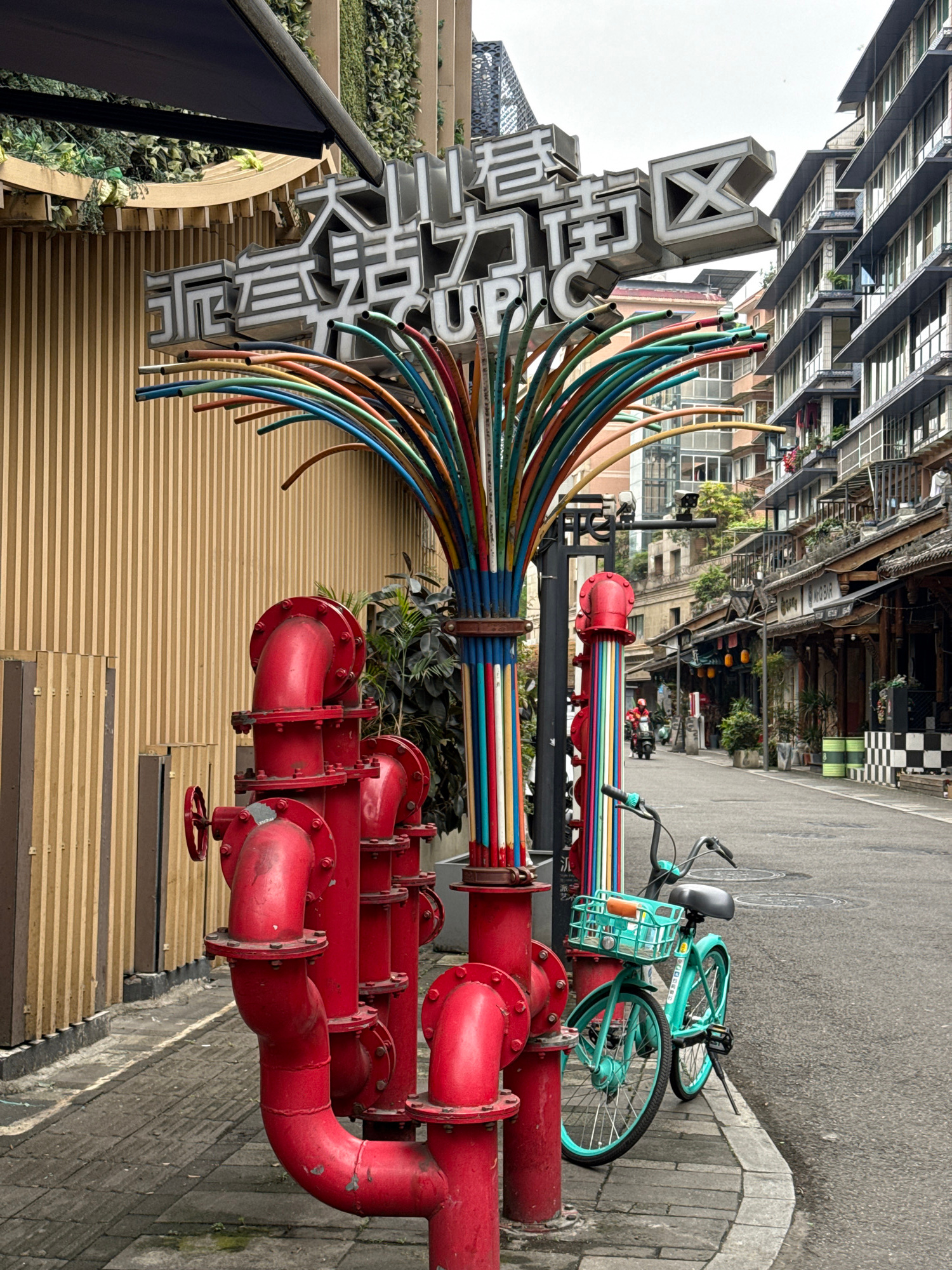 The image depicts a street scene in Jinjiang District, China, featuring colorful urban art installations. One installation consists of numerous brightly colored tubes emerging from a gray column with…read more