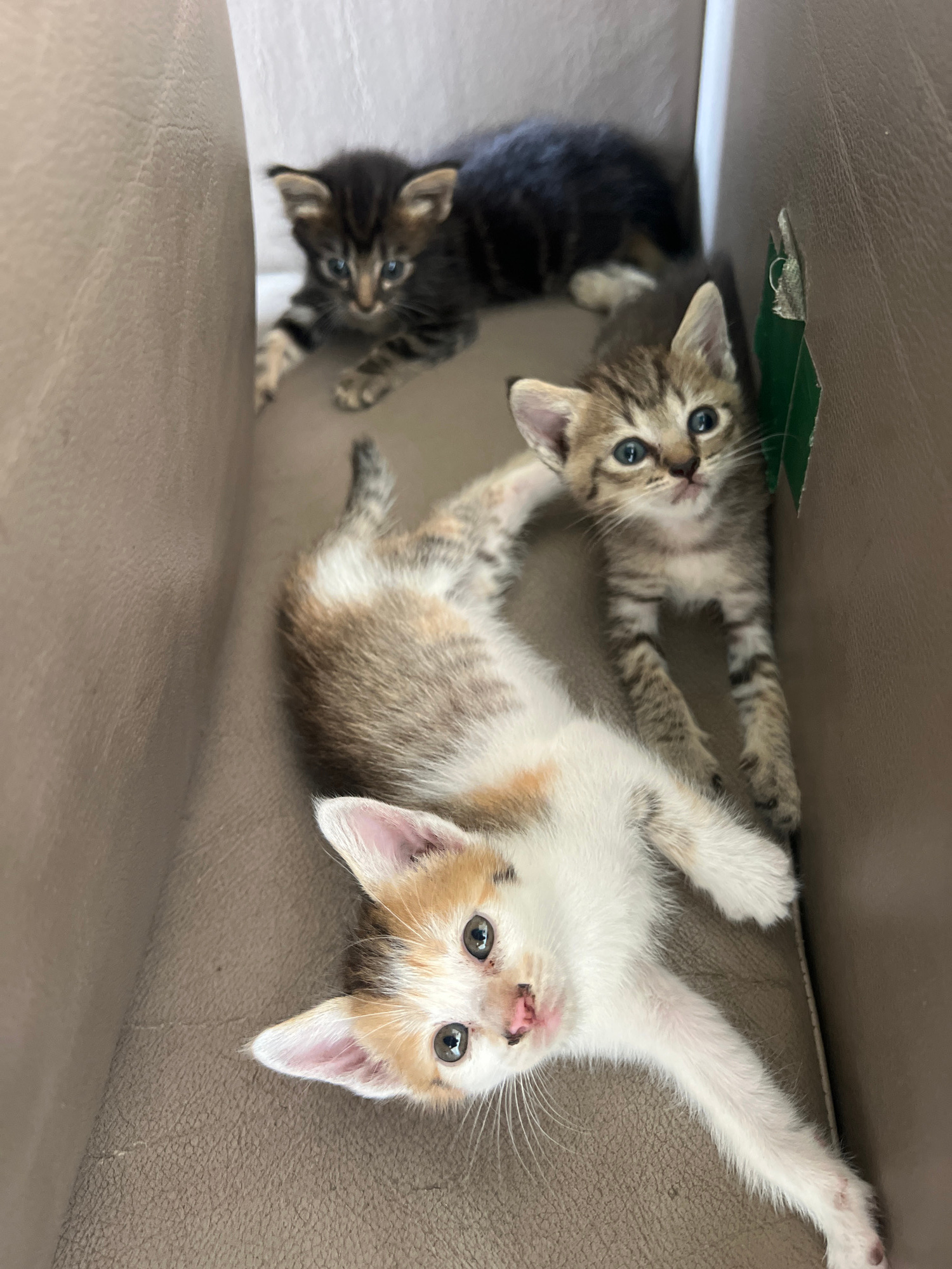 Three kittens are looking up from within a tan-colored cardboard box. One kitten is mostly brown with dark stripes, and two kittens have white and brown fur with stripes. The location is not specified…read more