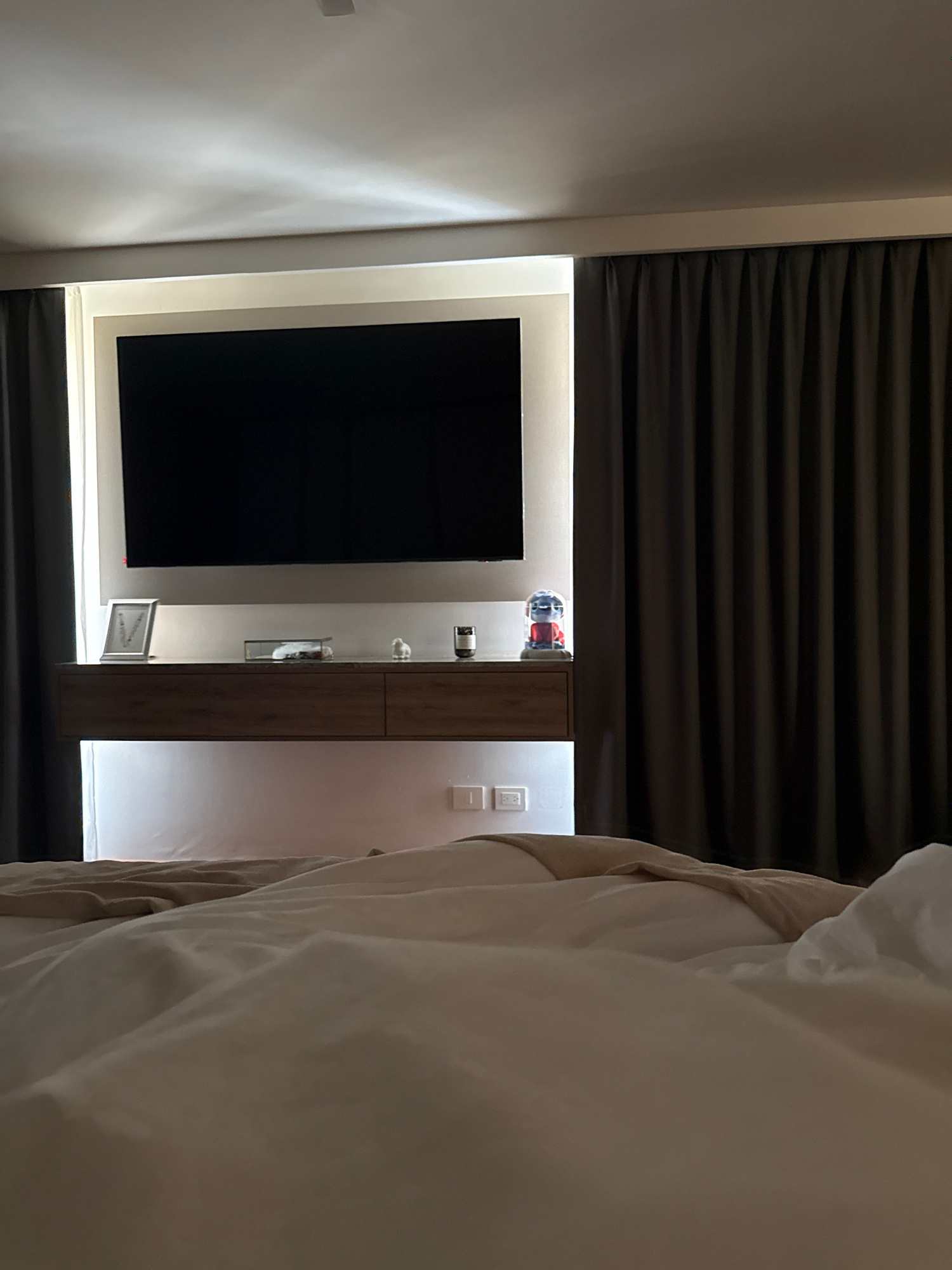 This image captures an interior scene, likely a modern hotel room or living space, viewed from a bed. The original image is rotated 90 degrees counter-clockwise. Upon re-orientation, the upper portio…read more