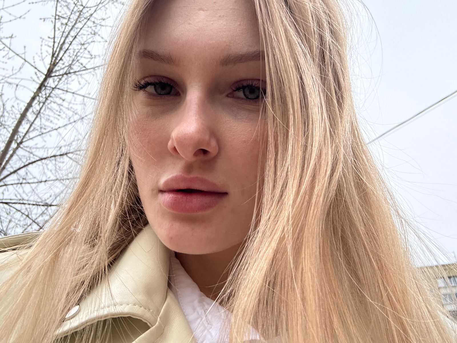 A close-up selfie of a woman with long blonde hair, taken at an upward angle. Her face is centered in the frame, with her eyes, nose, and mouth visible. She appears to be wearing a white top and a lig…read more