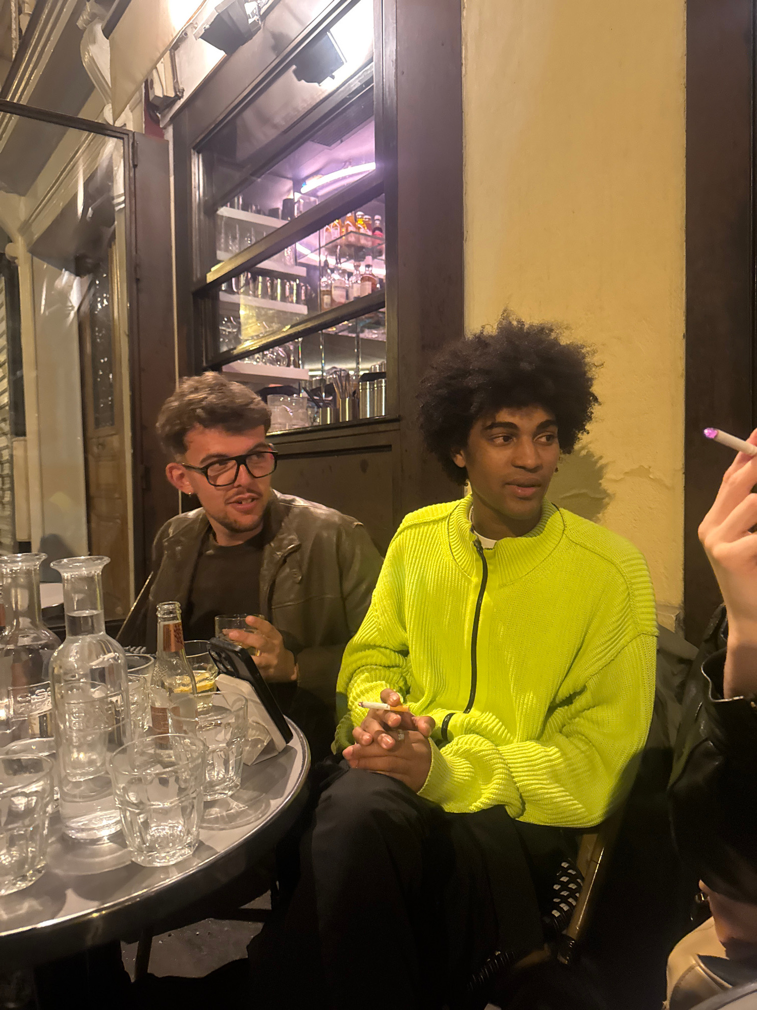 The image captures a casual social scene, likely in a bar or restaurant in Paris, France, given the architectural style of the building and interior design. Two men are prominently featured. One is we…read more