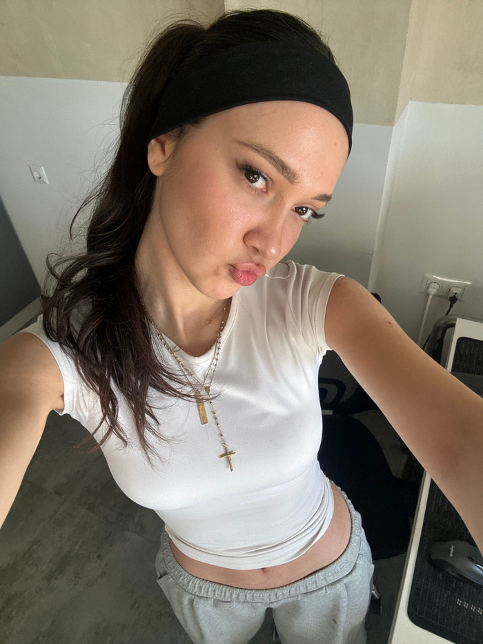 The scene is depicted as occurring in Zovuni, Armenia, as specified. The image presents a single female subject captured in a high-angle selfie. The individual has dark hair styled in a high ponytail,…read more