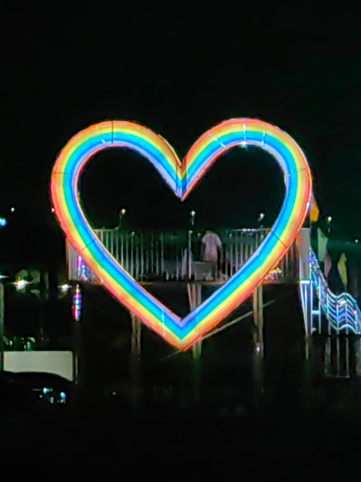 At night in Bai Chay Ward, Vietnam, a large, illuminated rainbow-colored heart sculpture stands on a structure over water. Faintly visible behind the heart are people and railings. The water reflects…read more