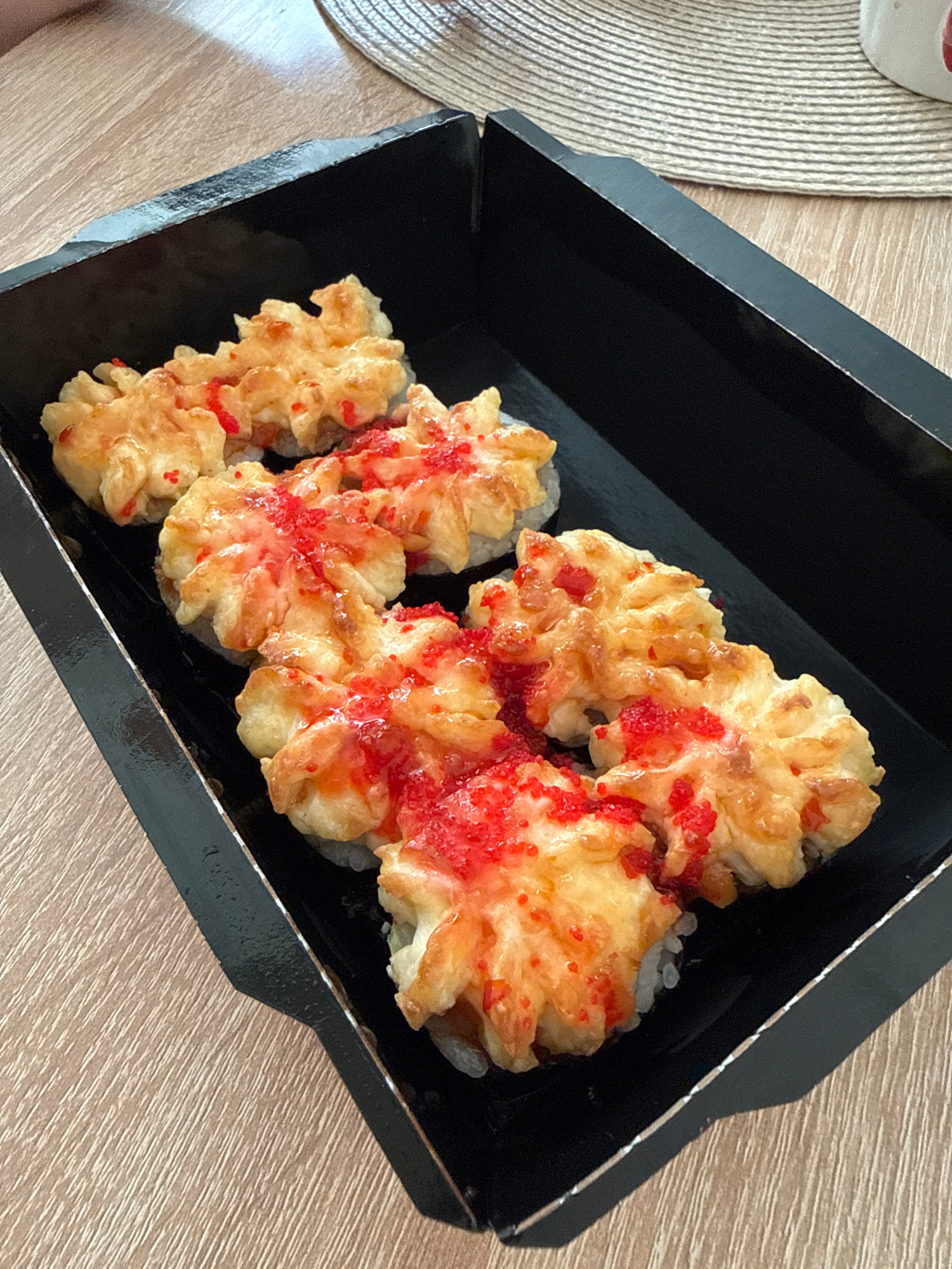 A close-up, high-angle shot captures a black rectangular takeout container filled with several pieces of baked or fried sushi rolls, placed on a light-brown wooden table with a distinct grain pattern.…read more