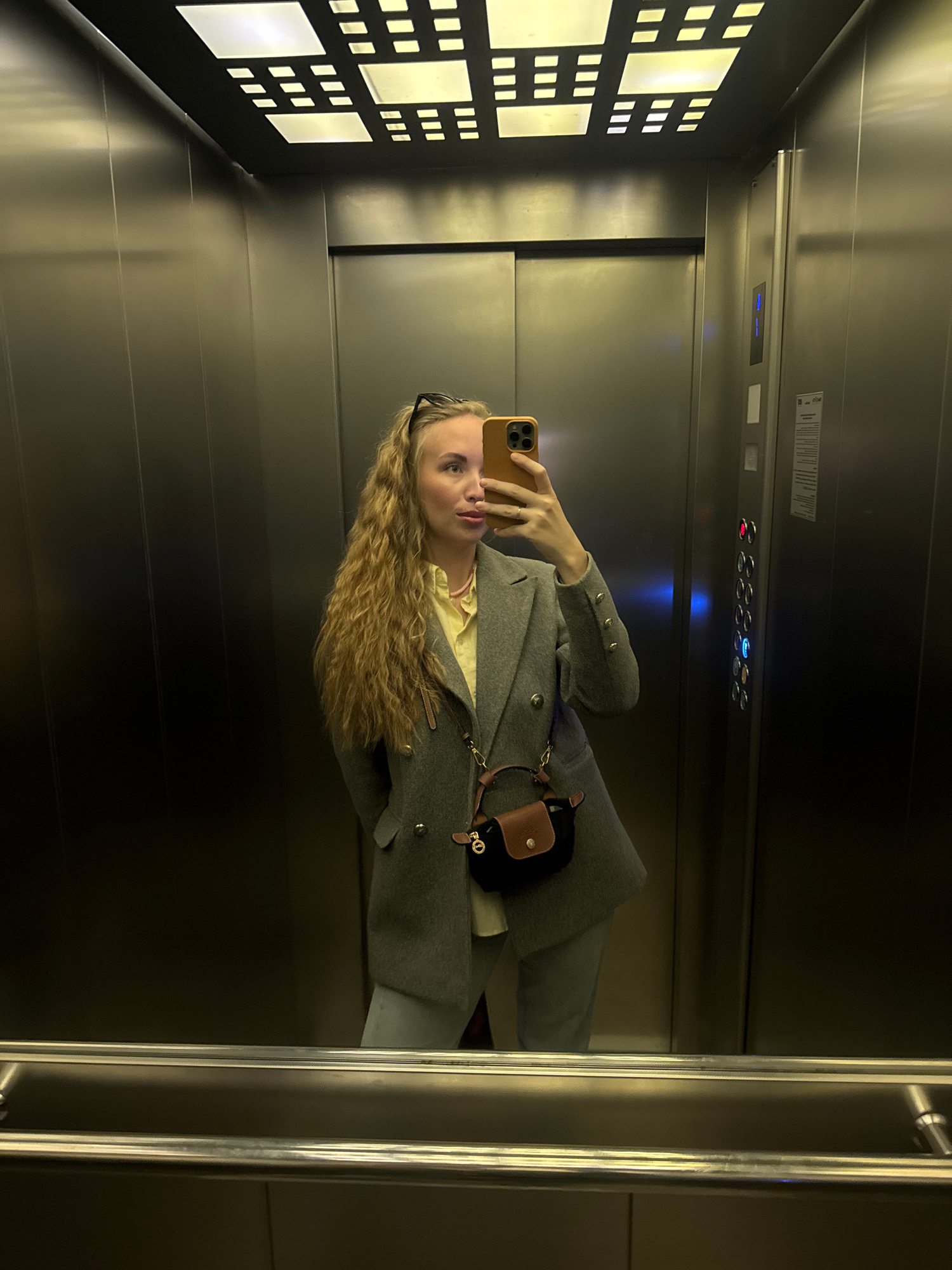 A person with long blonde hair is taking a selfie in an elevator. They are wearing a grey blazer over a yellow top and carrying a small brown and black purse. The elevator has a metallic interior with…read more